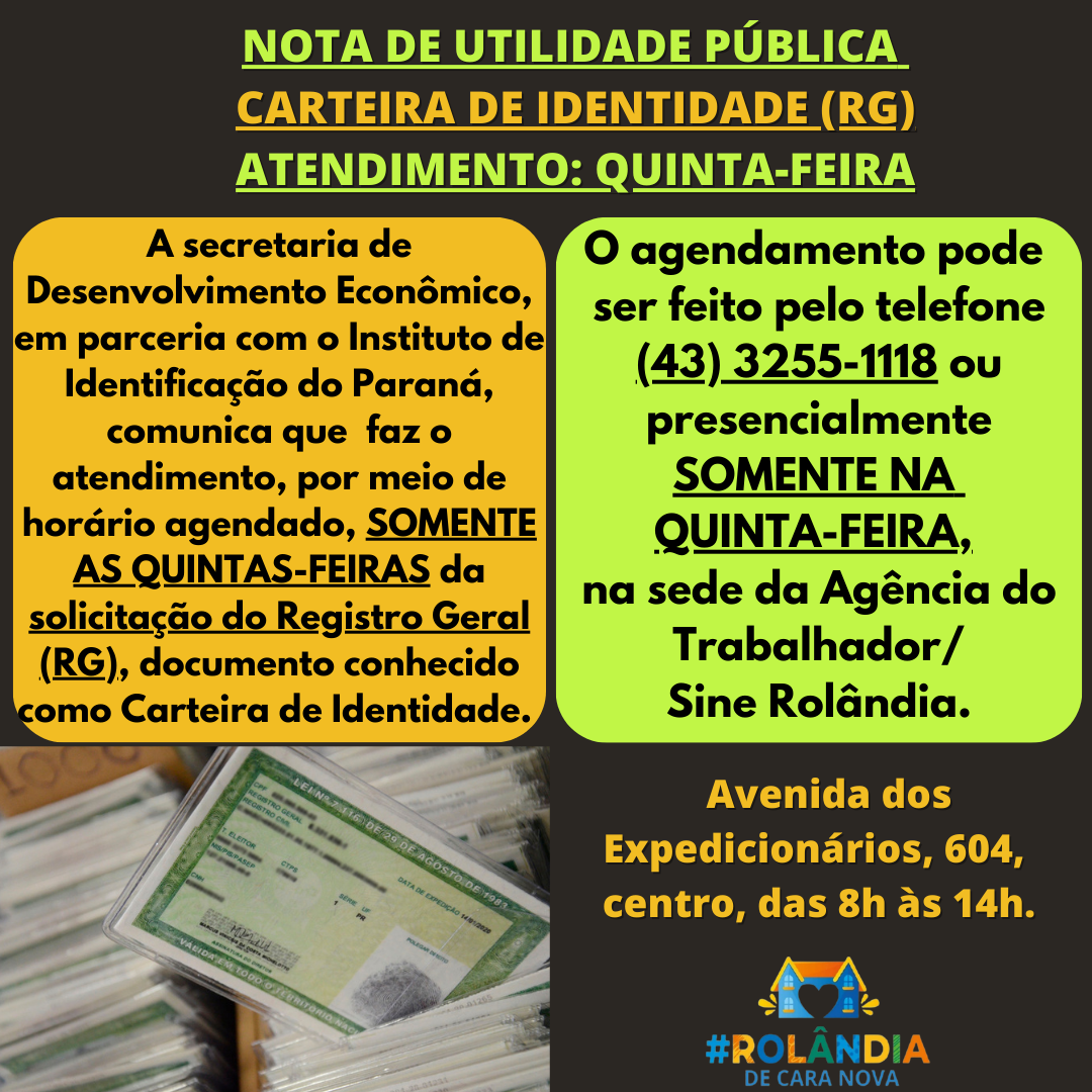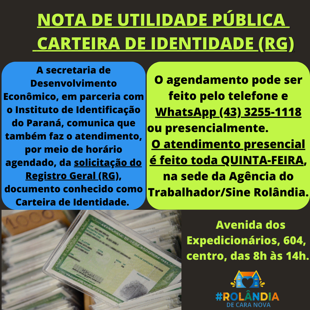 NOTA DE UTILIDADE PÚBLICA - CARTEIRA DE IDENTIDADEA secretaria de Desenvolvimento Econômico, em parceria com o Instituto de Identificação do Paraná, comunica que faz o atendimento, por meio de horário agendado, da solicitação do Registro Ge...