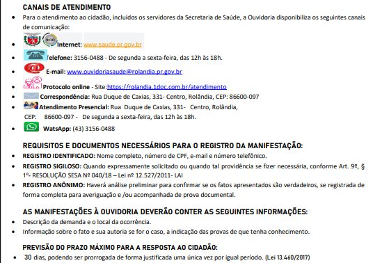 TEM ALGUM ELOGIO, CRÍTICA OU SUGESTÃO, PARA A SECRETARIA DE SAÚDE?FALE COM A OUVIDORIA DA SAÚDE!De segunda a sexta, das 12h às 18h!Fone/WhatsApp (43) 3156-0488....