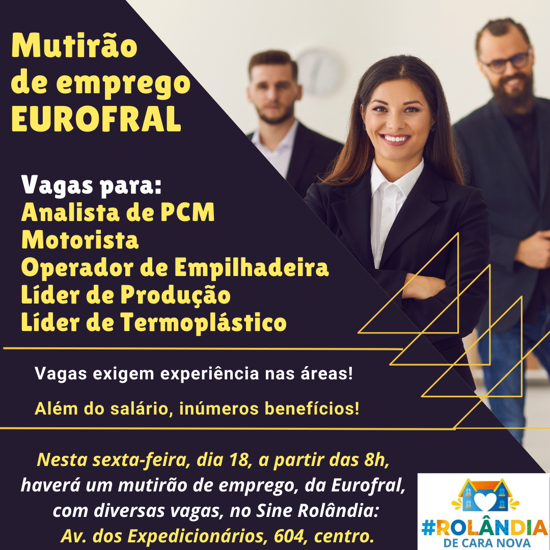 Mutirão do Emprego nesta sexta-feira, no SineA Agência do Trabalhador/Sine Rolândia, da secretaria de Desenvolvimento Econômico, informa que nesta sexta-feira, dia 18, a partir das 8h, haverá um mutirão de emprego, da Eurofral, com diversas vag...