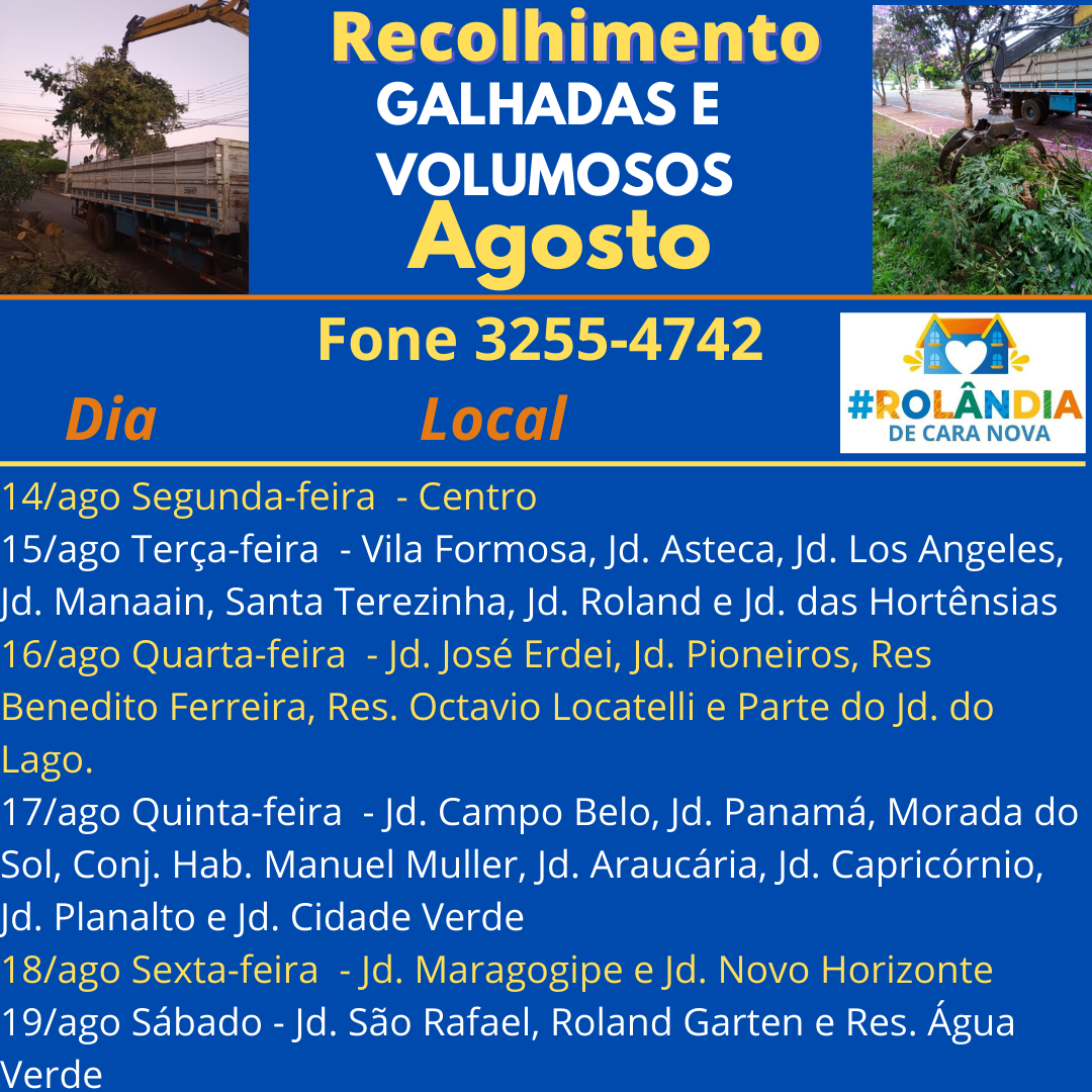 AGENDA DA SANETRAN PARA RECOLHER GALHADAS E VOLUMOSOS -AGOSTO (14 A 19)A Secretaria de Agricultura e Meio Ambiente informa que a empresa terceirizada que presta serviço ao município, a SANETRAN, faz a divulgação das regiões em que vai passar rec...