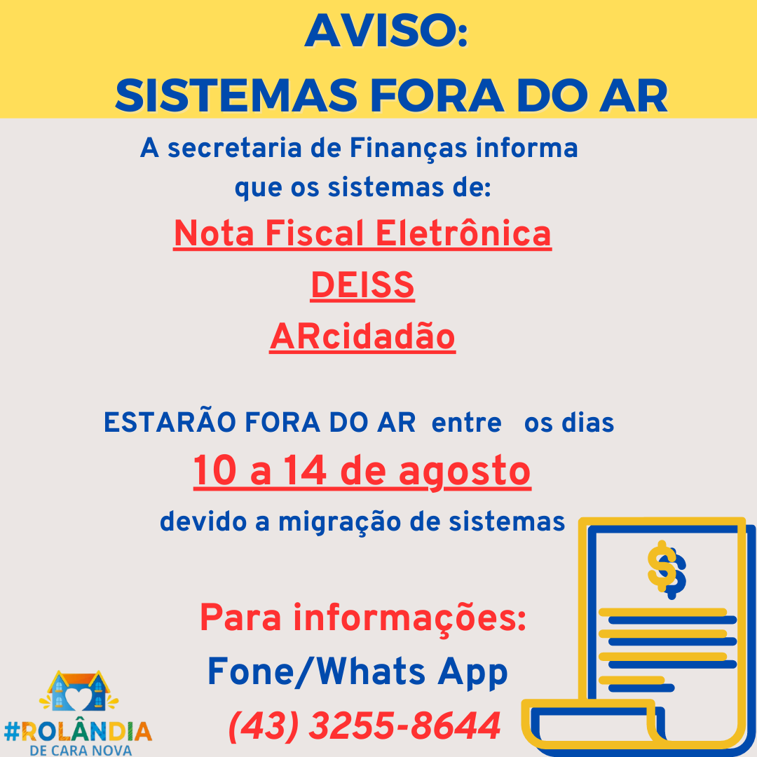 AVISO: SISTEMAS FORA DO ARA secretaria de Finanças informa que os sistemas de Nota Fiscal Eletrônica, DEISS e ARcidadão ESTARÃO FORA DO AR, entre dias 10 a 14 de agosto, devido a migração de sistemas. Mais informações (43) 3255-8644....