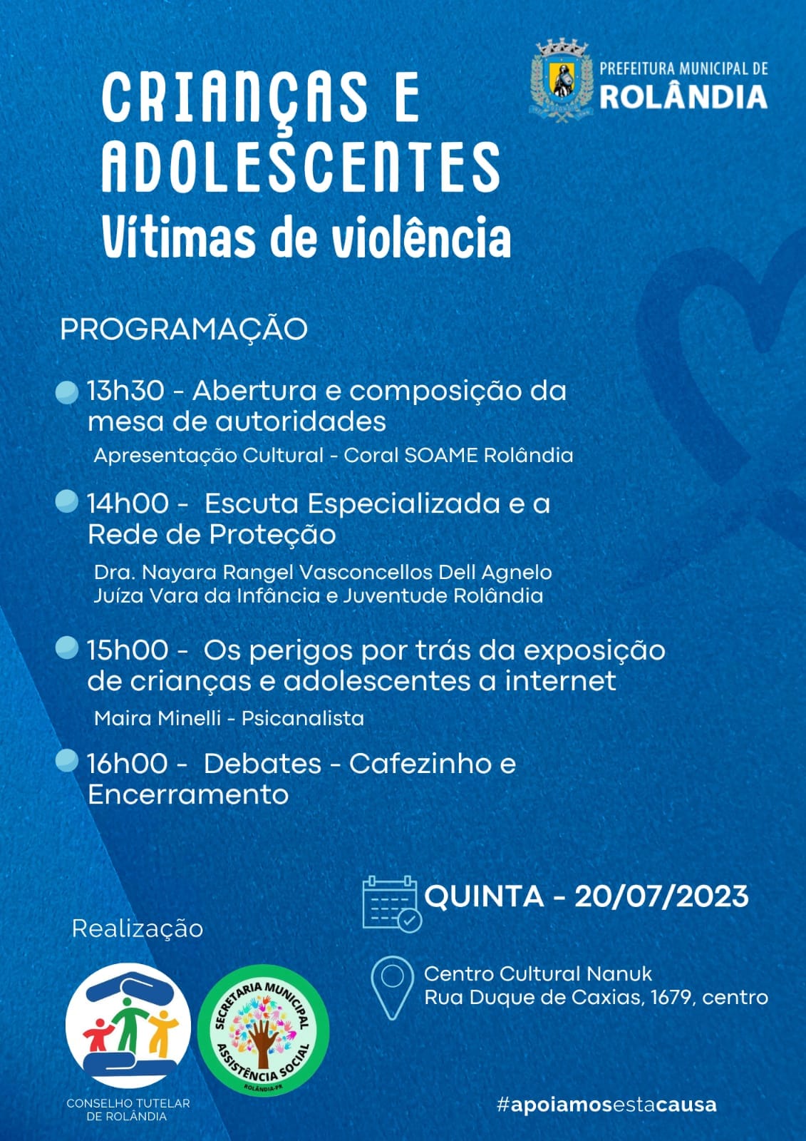 NESTA QUINTA-FEIRA, A SECRETARIA DE ASSISTÊNCIA SOCIAL E O CONSELHO TUTELAR PROMOVEM UM EVENTO PARA DISCUTIR UM TEMA MUITO IMPORTANTE PARA A SOCIEDADE ROLANDENSE!Entrada gratuita!Participe!...