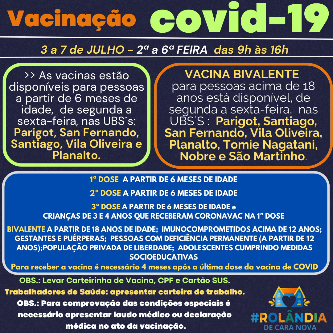 VACINAÇÃO COVID-19A secretaria de Saúde informa a programação de vacinação contra a covid-19.Não precisa agendar!Vem vacinar!PROGRAMAÇÃO VACINAS3 A 7 DE JULHO DE 2023 - das 9h à s 16h.>>As vacinas contra COVID-19 estão disponÃveis, para p...