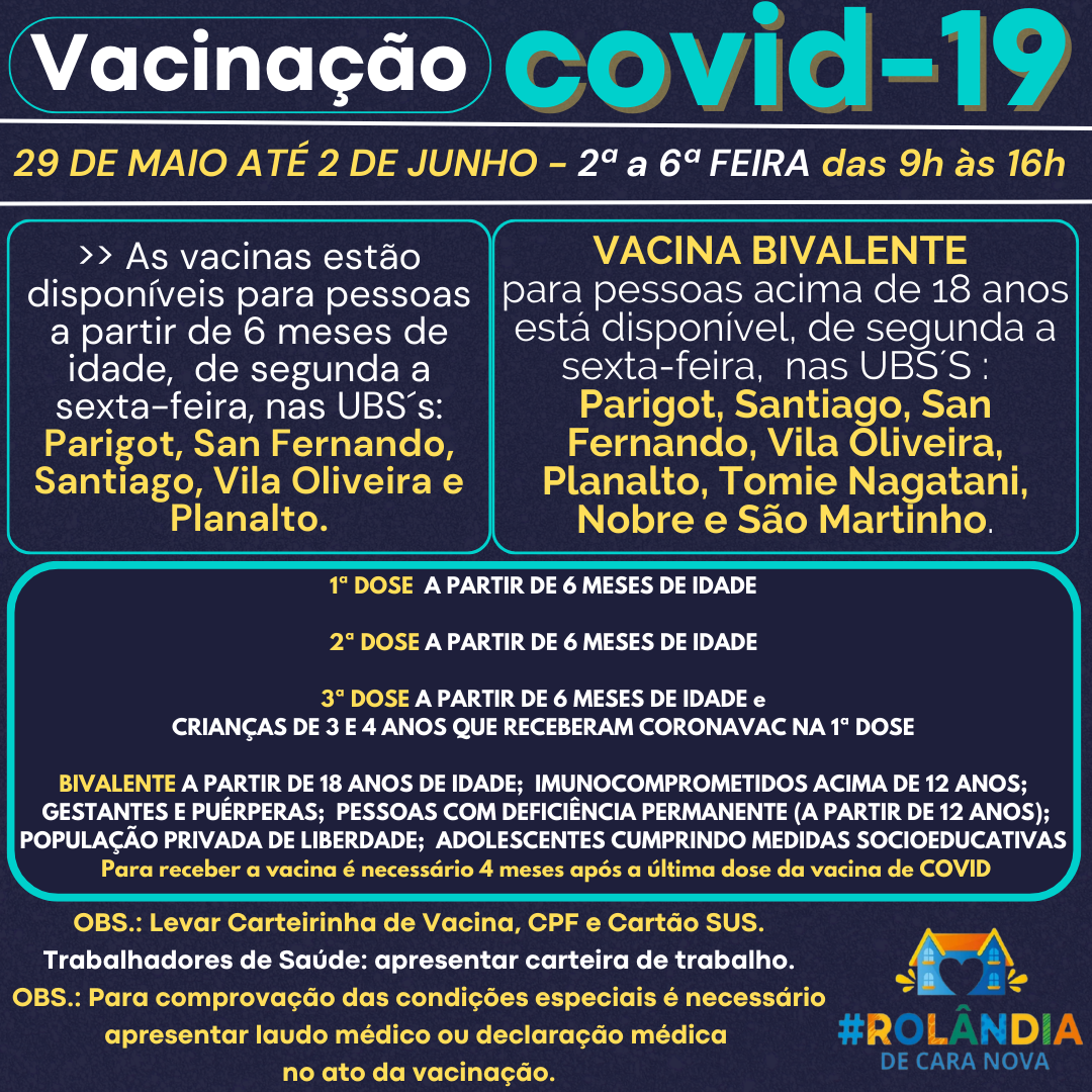 VACINAÇÃO COVID-19A secretaria de Saúde informa a programação de vacinação contra a covid-19. Não precisa agendar! Vem vacinar! PROGRAMAÇÃO VACINAS29 DE MAIO A 2 DE JUNHO DE 2023 - das 9h às 16h. >>As vacinas contra COVID-19 estão dispo...
