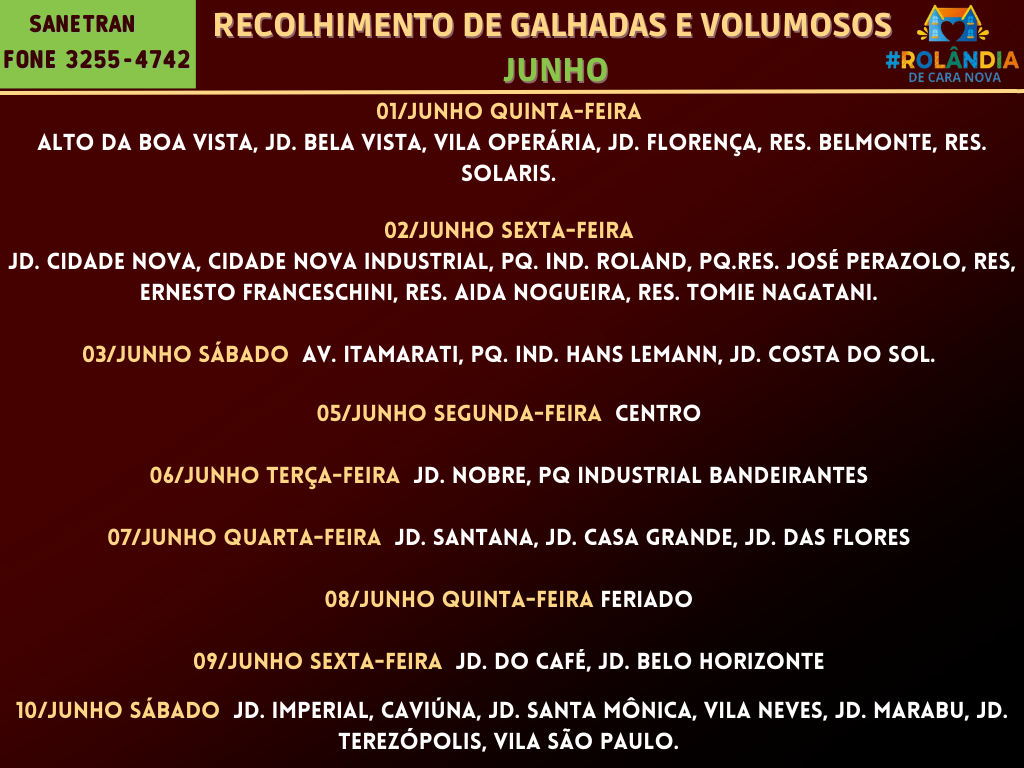 AGENDA DA SANETRAN PARA RECOLHER GALHADAS E VOLUMOSOS -JUNHOA Secretaria de Agricultura e Meio Ambiente informa que a empresa terceirizada que presta serviço ao município, a SANETRAN, faz a divulgação das regiões em que vai passar recolhendo vol...