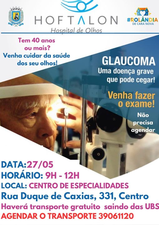 AGENDE SEU TRANSPORTE PARA FAZER EXAME DE GLAUCOMA NO SÁBADOAgende seu transporte com antecedência e venha fazer exame gratuito para Glaucoma no sábado!Fone 3906-1120....