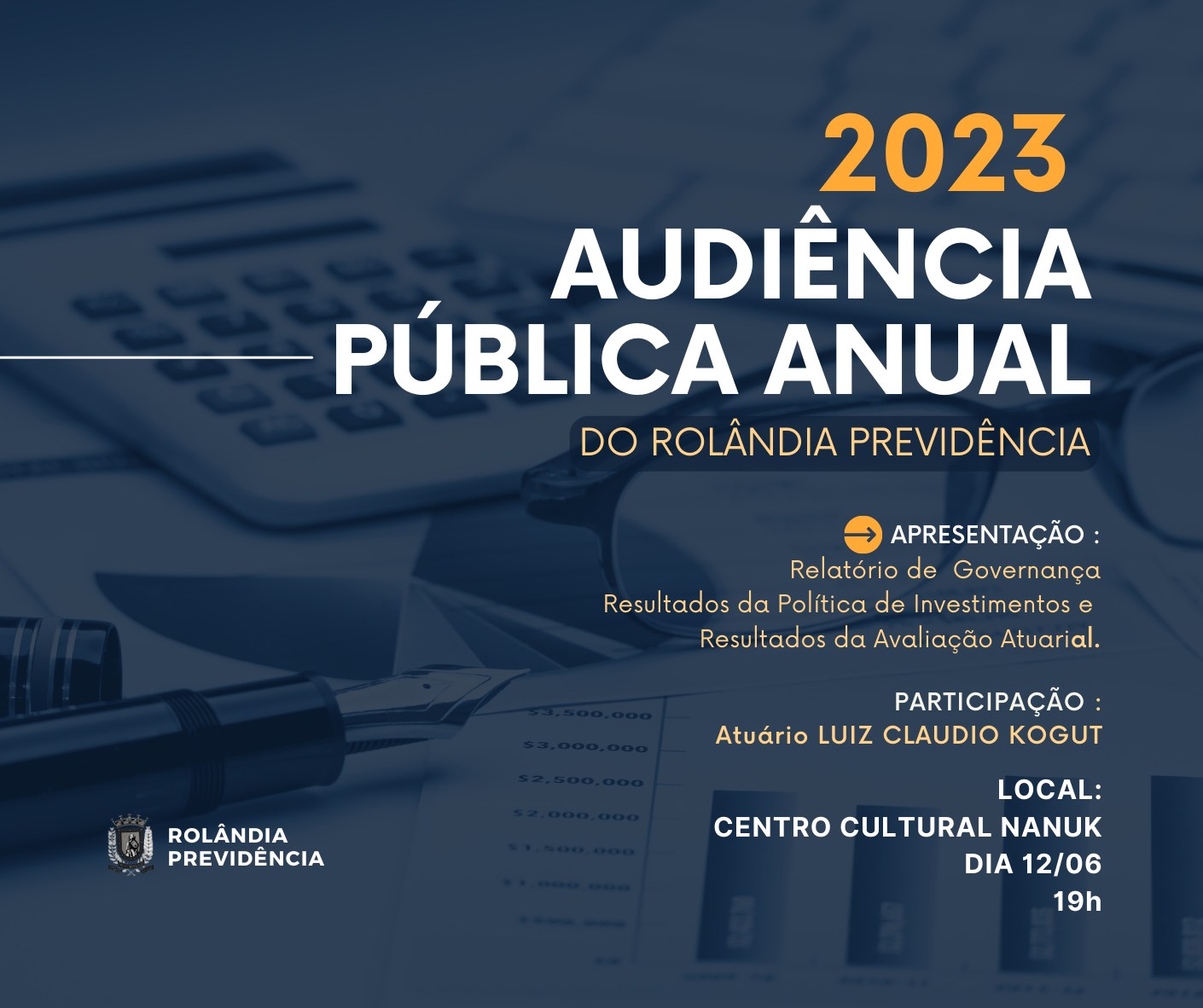 AUDIÊNCIA PÚBLICA ANUAL - ROLÂNDIA PREVIDÊNCIAFoi publicado no Diário Oficial o Edital 01/2023, que convoca servidores públicos municipais segurados ativos, aposentados, pensionistas e a população em geral, para participarem no dia 12 de Junh...