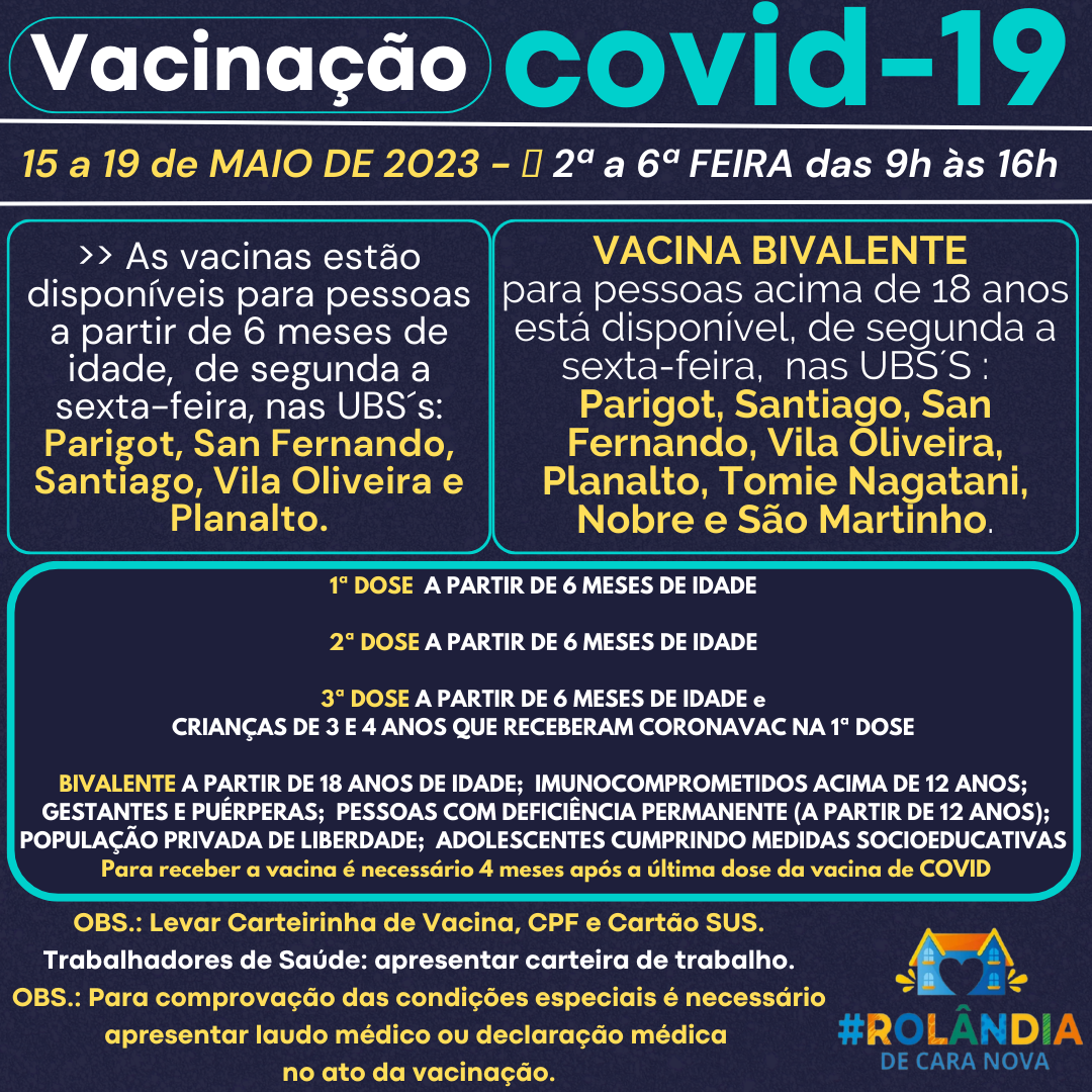 VACINAÇÃO COVID-19A secretaria de Saúde informa a programação de vacinação contra a covid-19.Não precisa agendar! Vem vacinar!PROGRAMAÇÃO VACINAS15 a 19 de MAIO DE 2023 - das 9h às 16h.>>As vacinas contra COVID-19 estão disponíveis, para...
