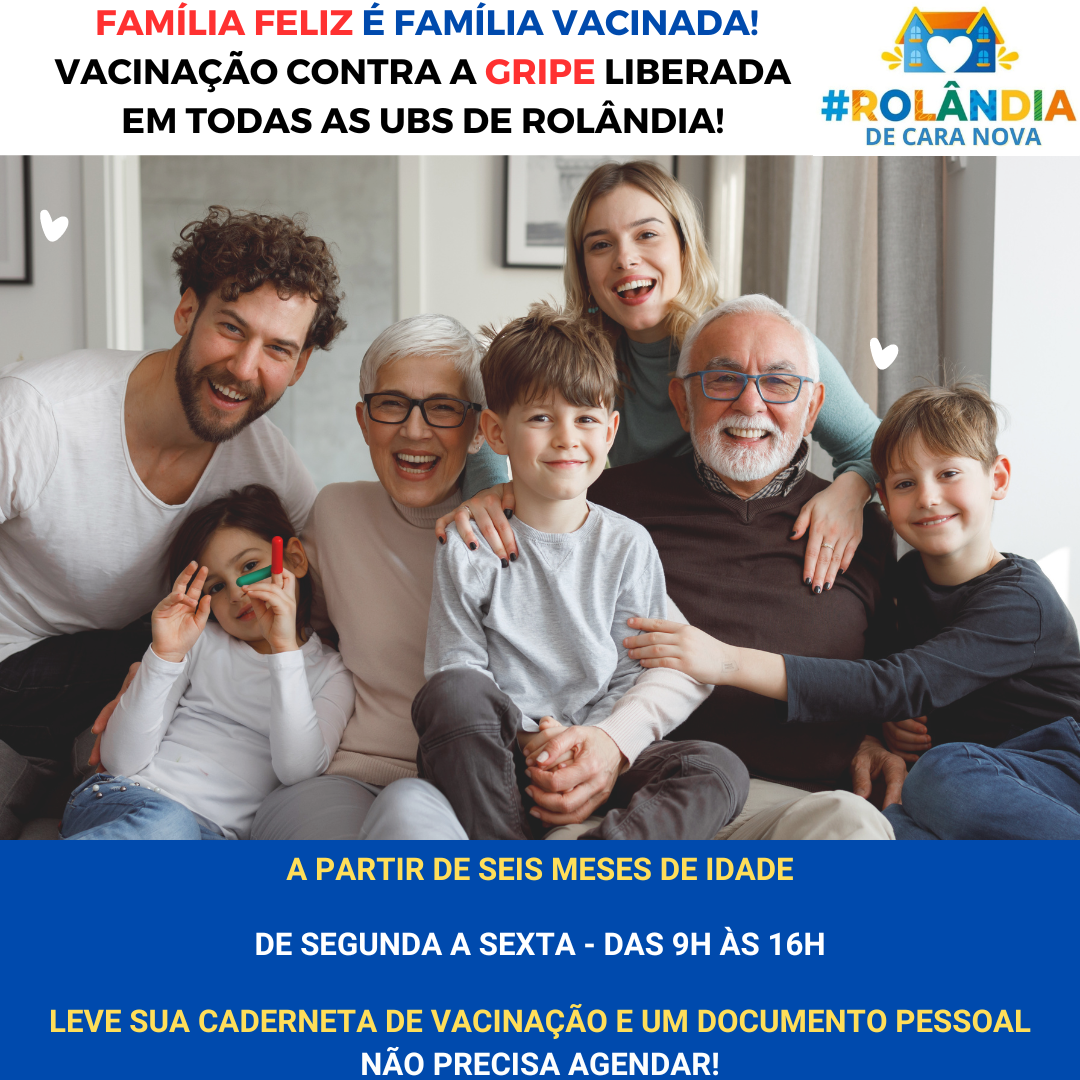 VACINAÇÃO CONTRA A GRIPE LIBERADA PARA PESSOAS COM SEIS MESES OU MAISA secretaria de Saúde informa que a partir de segunda-feira (15), a vacinação contra a gripe será ampliada para toda a população rolandense, a partir dos seis meses de idade...