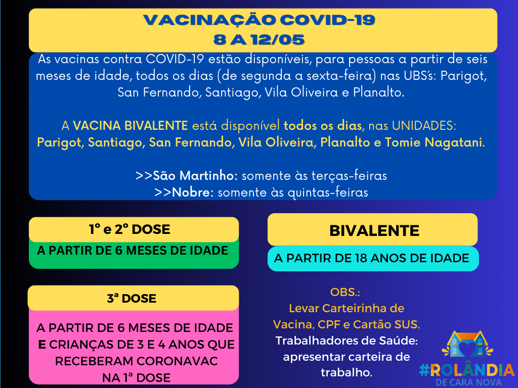 PROGRAMAÇÃO VACINAS8 a 12 de MAIO DE 2023A secretaria municipal de Saúde informa sobre a campanha de vacinação contra a covid-19, das 9h às 16h, de segunda a sexta-feira. As vacinas contra COVID-19 estão disponíveis, para pessoas a partir de ...