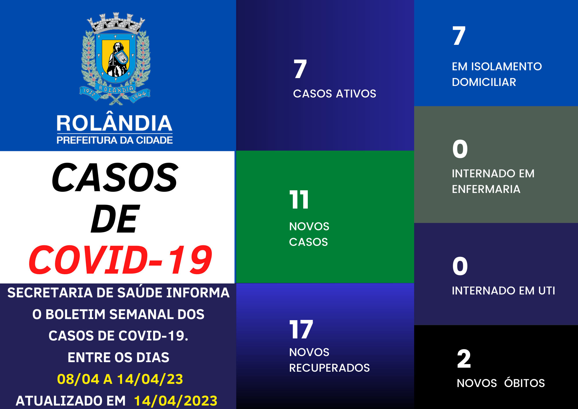 BOLETIM COVID-19A secretaria municipal de Saúde informa sobre os casos de covid-19, entre os dias 8 a 14/04 de 2023. Na atualização do boletim, 11 contaminações e 17 pacientes curados. Rolândia tem 7 pacientes com covid-19, todos em isolamen...