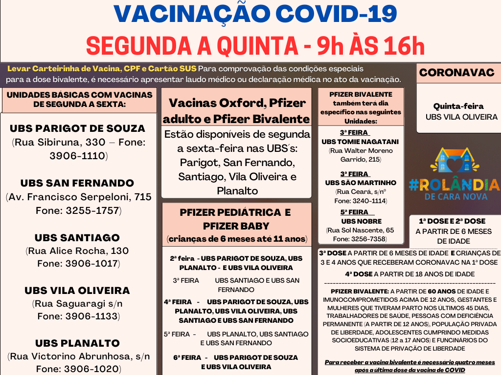 VACINAÇÃO COVID-19A secretaria de Saúde informa sobre a campanha de vacinação contra a covid-19.Confira o informe para os dias 17 a 20 de abril, das 9h às 16h:As vacinas Oxford, Pfizer adulto e Pfizer Bivalente estarão disponíveis todos os di...