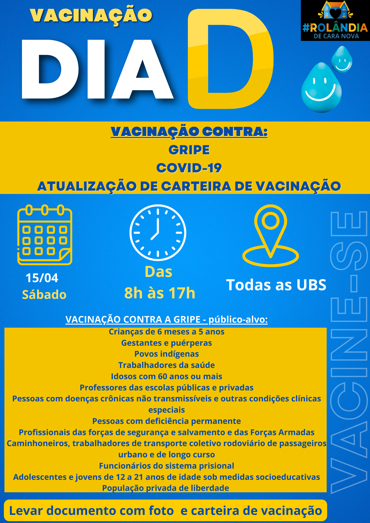 SÁBADO É DIA "D" DE VACINAÇÃO!Todas as Unidades Básicas de Saúde (UBS) vão abrir para vacinar contra covid-19, gripe e atualização da carteira de vacinação.Neste sábado, dia 15/04, das 8h às 17h!VEM VACINAR!...