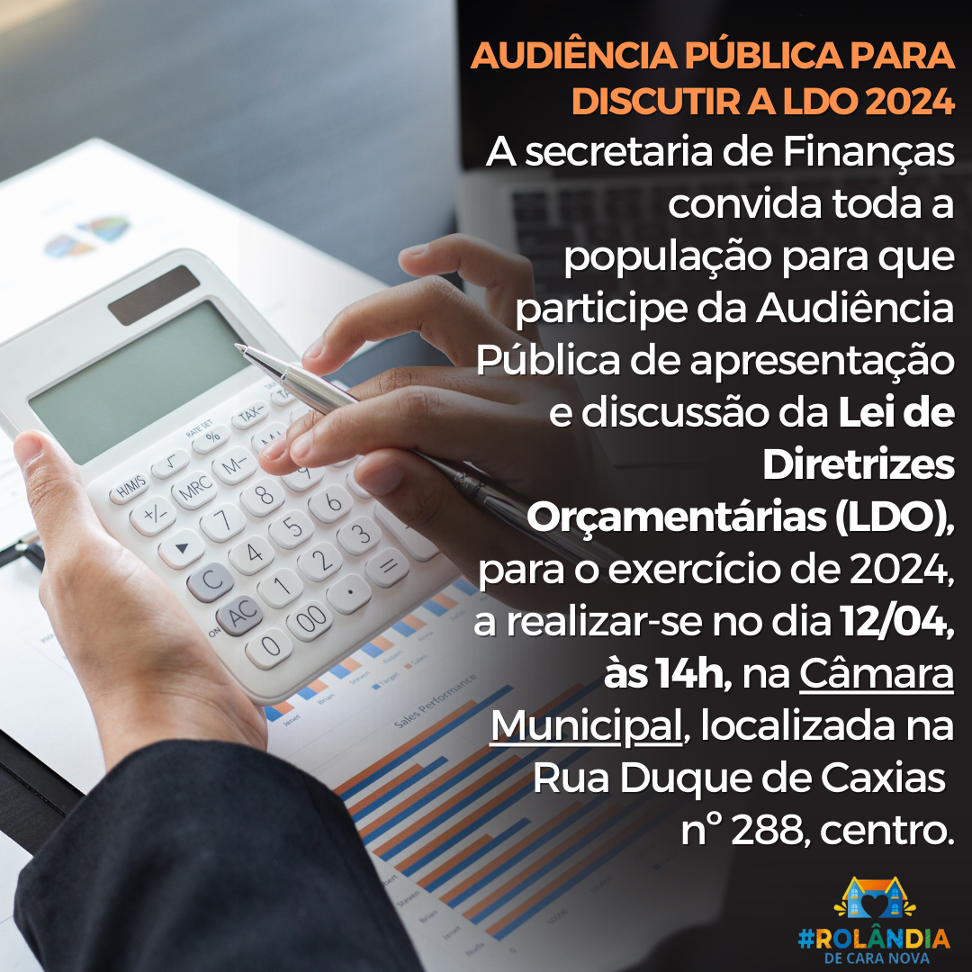 AUDIÊNCIA PÚBLICA PARA DISCUTIR A LDO 2024A secretaria de Finanças convida toda a população para que participe da Audiência Pública de apresentação e discussão da Lei de Diretrizes Orçamentárias (LDO), para o exercício de 2024, a realiza...