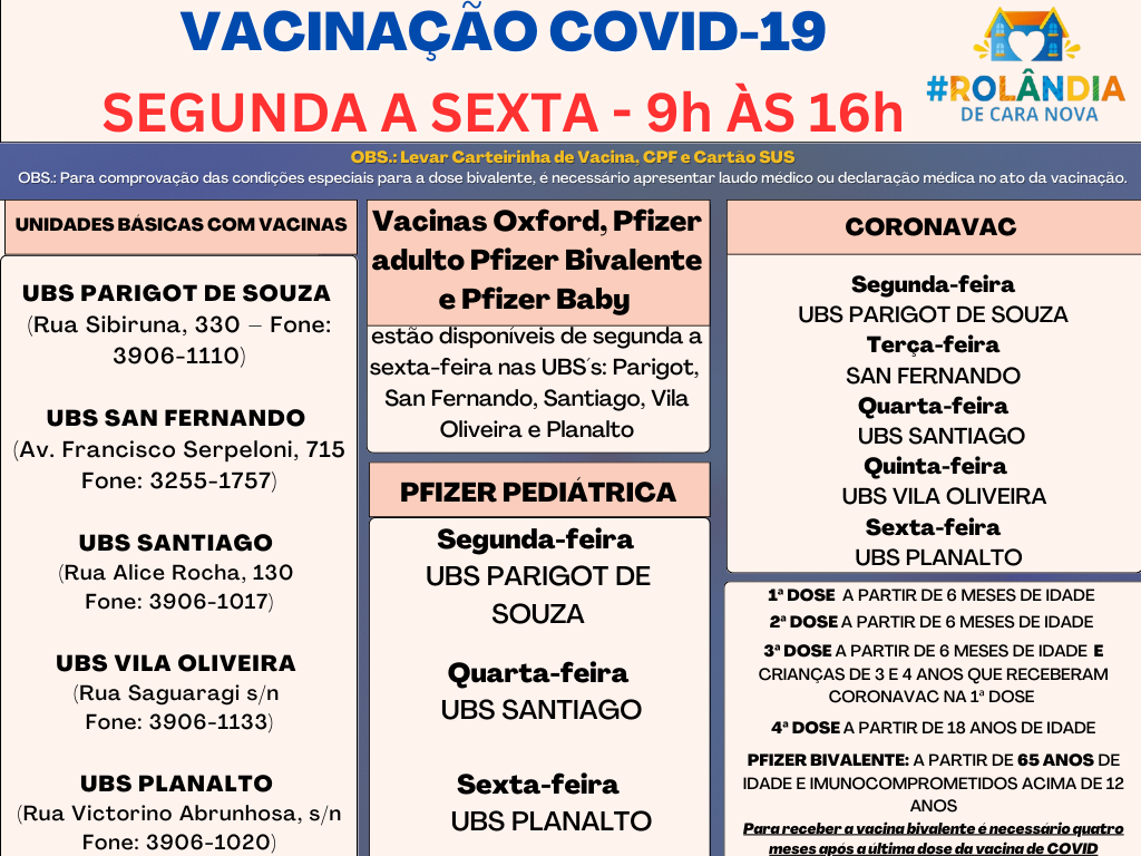 PROGRAMAÇÃO VACINASCOVID-1913 a 17 de MARÇO DE 2023As vacinas Oxford, Pfizer adulto e Pfizer Baby e Pfizer Bivalente estarão disponíveis todos os dias (de segunda a sexta-feira) nas UBS´s: Parigot, San Fernando, Santiago, Vila Oliveira e Planal...