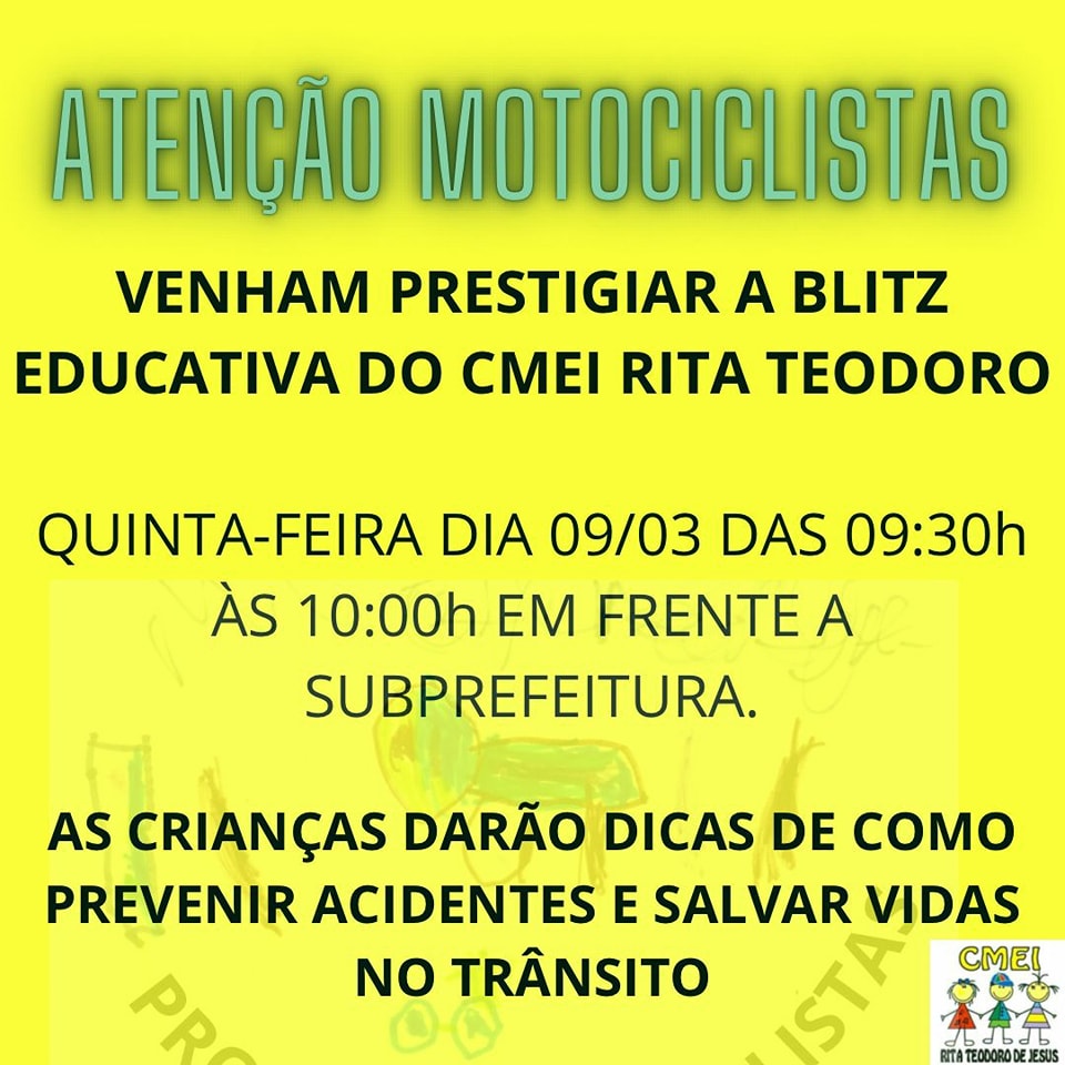 CMEI RITA TEODORO CONVIDA MOTOCICLISTAS DO DISTRITO NOSSA SENHORA APARECIDA PARA "BLITZ EDUCATIVA"Devido ao crescente número de acidentes envolvendo motos e simultaneamente ao Projeto Motociclistas que está sendo desempenhado pela Polícia Rodoviá...