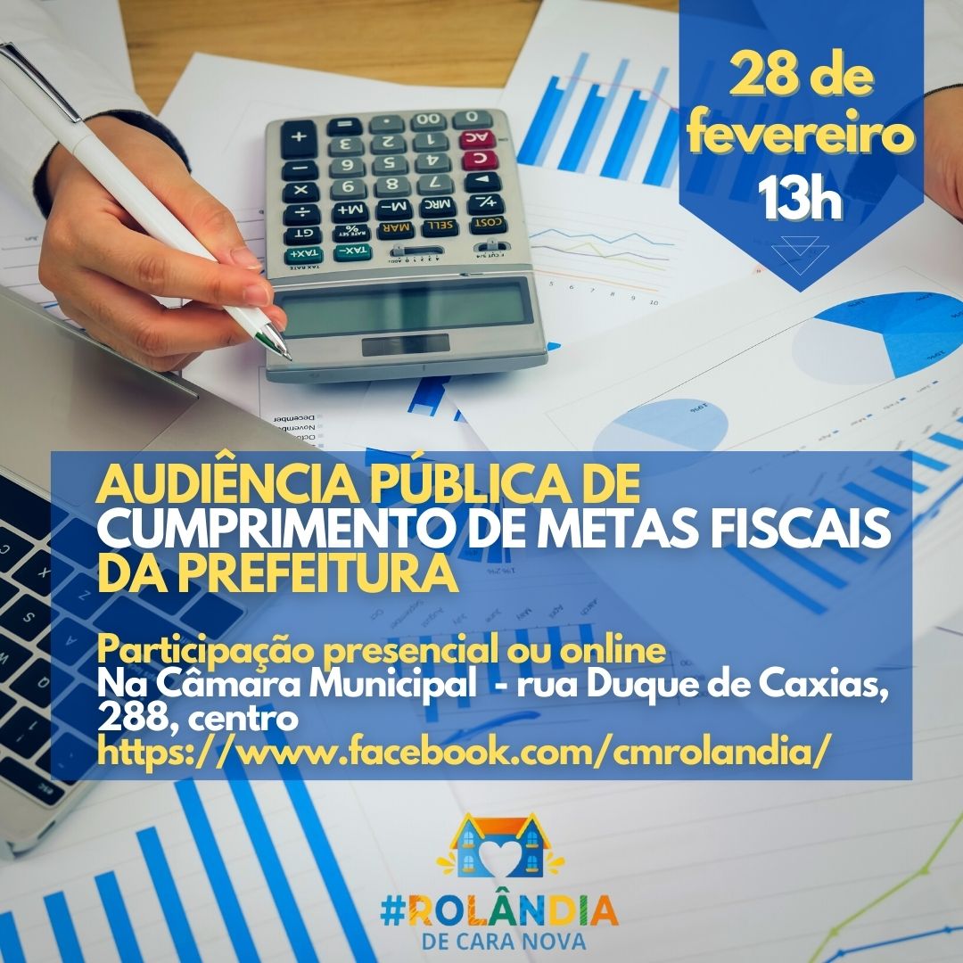 AUDIÊNCIA PÚBLICA DE CUMPRIMENTO DE METAS FISCAIS DA PREFEITURAA secretaria de Finanças e a Câmara Municipal de Rolândia, através da Comissão de Orçamento, Tributação e Finanças, convidam para a Audiência Pública de avaliação do cumpri...