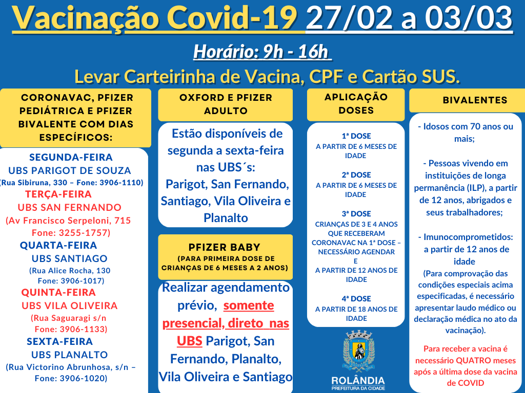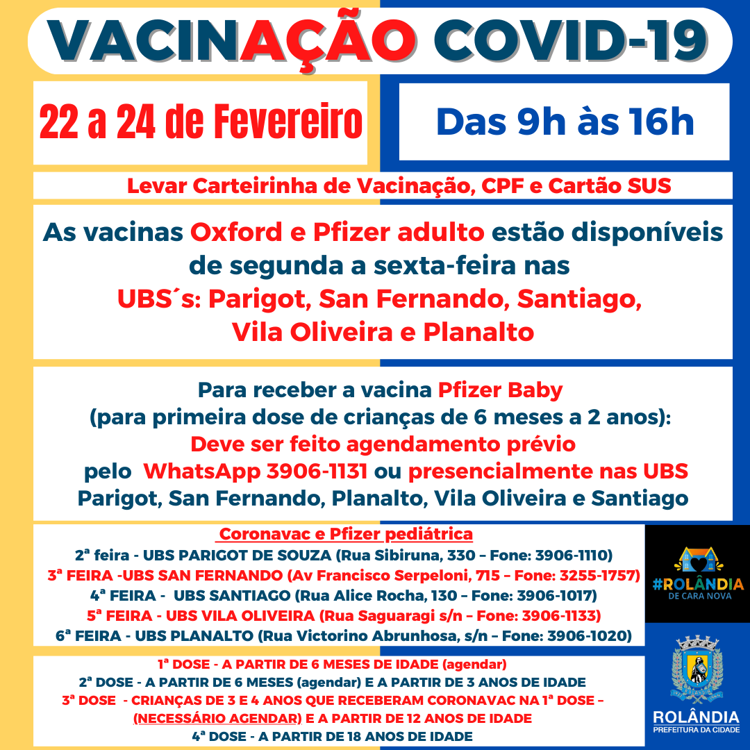 VACINAÇÃO CONTRA A COVID-19A secretaria de Saúde informa sobre a vacinação em Rolândia contra a covid-19.22 A 24 DE FEVEREIRO DE 20232ª a 6ª FEIRA das 9h às 16h1ª DOSE - A PARTIR DE 6 MESES DE IDADE (agendar)2ª DOSE - A PARTIR DE 3 ANOS DE...