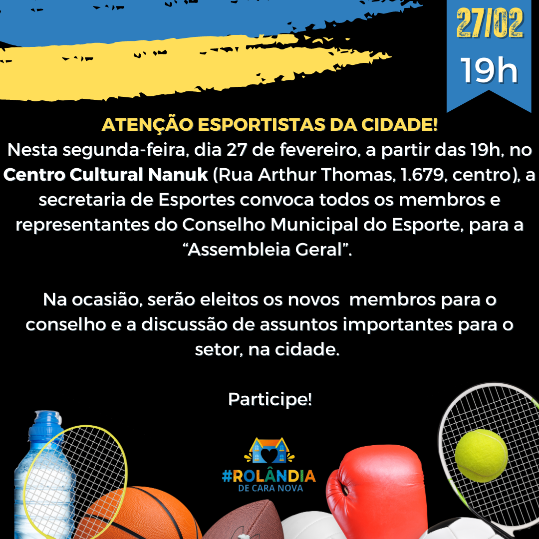 ATENÇÃO ESPORTISTAS DA CIDADE!Nesta segunda-feira, dia 27 de fevereiro, a partir das 19h, no Centro Cultural Nanuk (Rua Arthur Thomas, 1.679, centro), a secretaria de Esportes convoca todos os membros e representantes do Conselho Municipal do Espor...