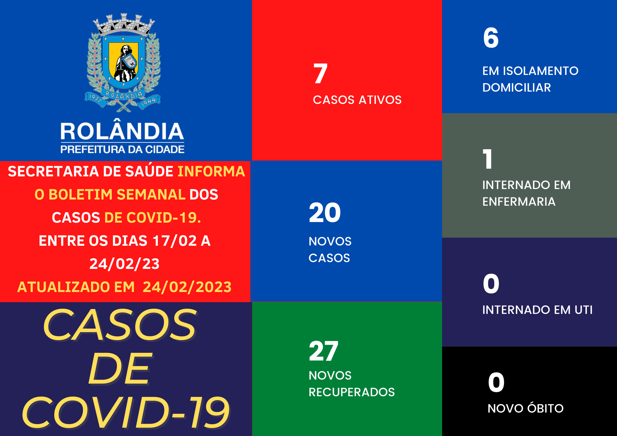 BOLETIM COVID-19A secretaria municipal de Saúde informa sobre os casos de covid-19, entre os dias 17 a 24/02 de 2023. Na atualização do boletim, 20 contaminações e 27 pacientes curados. Rolândia tem 7 pacientes com covid-19, sendo 6 em isola...