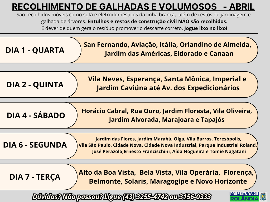 COLETA DE GALHADAS E VOLUMOSOS - ABRIL As Secretarias de Serviços Públicos e de Agricultura e Meio Ambiente informam que a empresa terceirizada que presta serviço ao município, a SANETRAN, passa recolhendo volumosos dei...