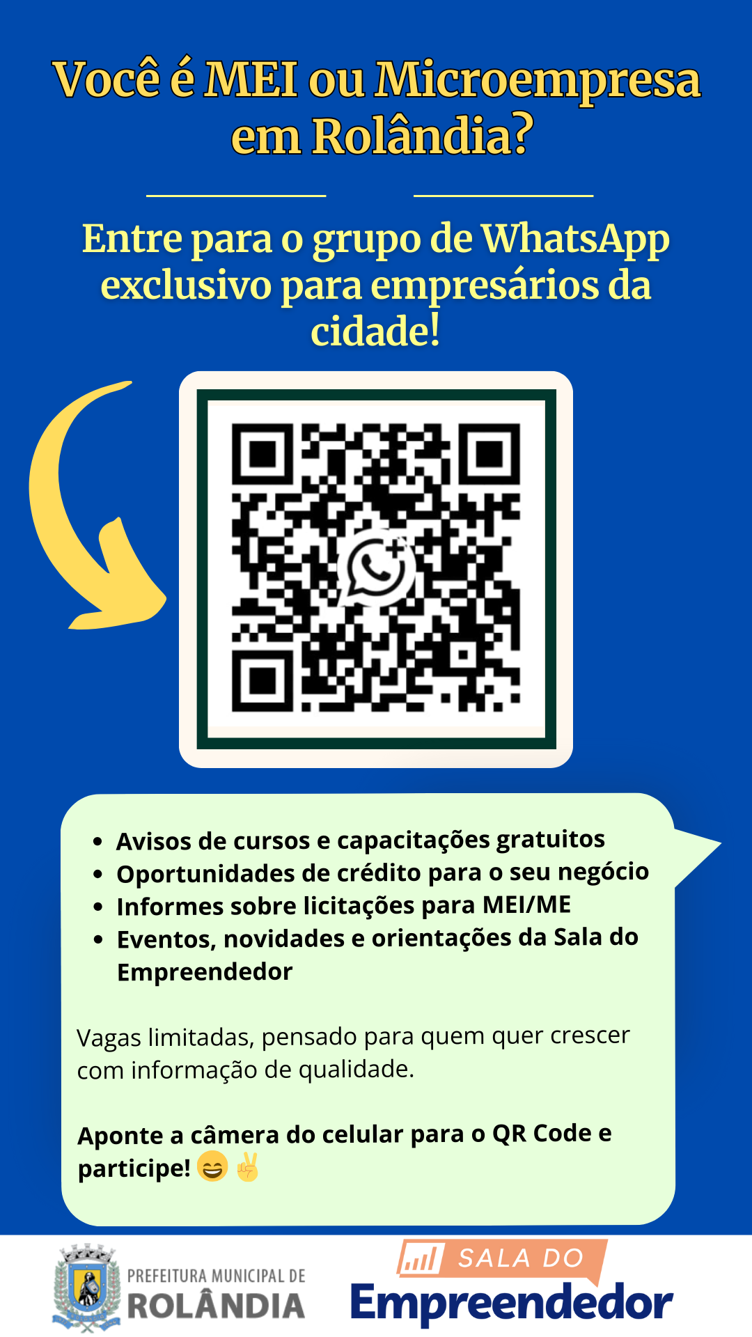 Você é MEI ou Microempresa em Rolândia? Entre para o grupo de WhatsApp exclusivo de empresários da cidade. No grupo, você vai receber: Avisos de cursos e capacitações gratuitos. Oportunidades ...