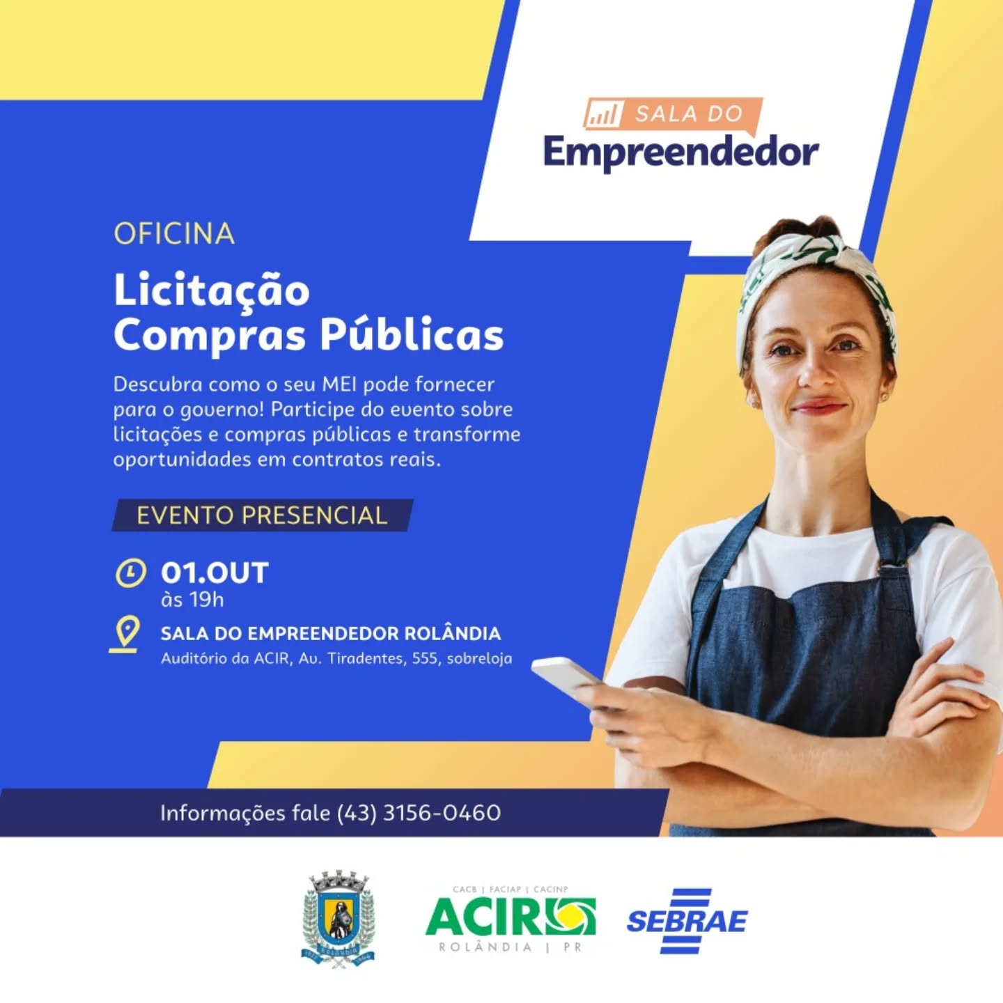 Oficina: Licitação e Compras Públicas   Você sabia que o seu MEI pode fornecer para o governo?   Participe da nossa oficina e descubra como transformar oportunidades em contratos reais!   ...