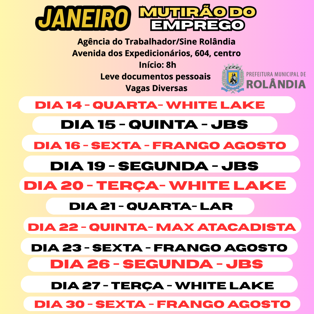 Vagas de Emprego - SINE Rolândia -dia 13/01/2026 1. Agente de inspeção qualidade/SIF/JBS/SEARA 2. Ajudante de açougueiro/Mercado 3. Ajudante de carga e descarga 4. Ajudante de cozinha/JBS/SEARA 5. Ajudante de...
