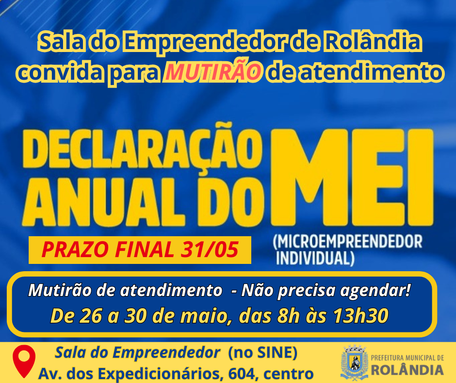 ATENÇÃO MEI´S DE ROLÂNDIA! A secretaria de Desenvolvimento Econômico, por meio da Sala do Empreendedor alerta aos Microempreendedor Individual (MEI´s), que eles devem apresentar até 31 de maio de ca...