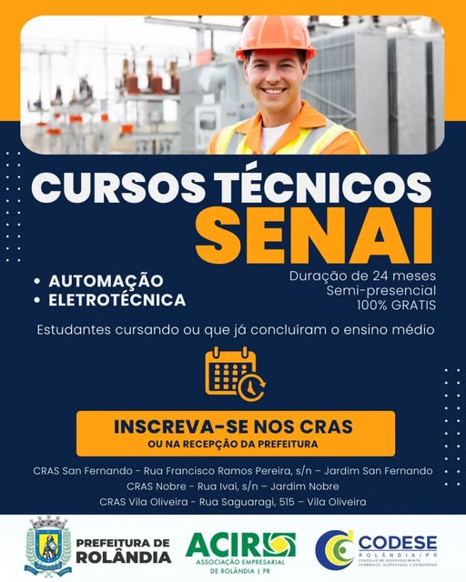 INSCRIÇÕES ABERTAS PARA DOIS CURSOS TÉCNICOS GRATUITOS: ELETROTÉCNICA E AUTOMAÇÃO   A Prefeitura de Rolândia, por meio da Central Municipal de Cursos, parceria das secretarias de Desenvolviment...