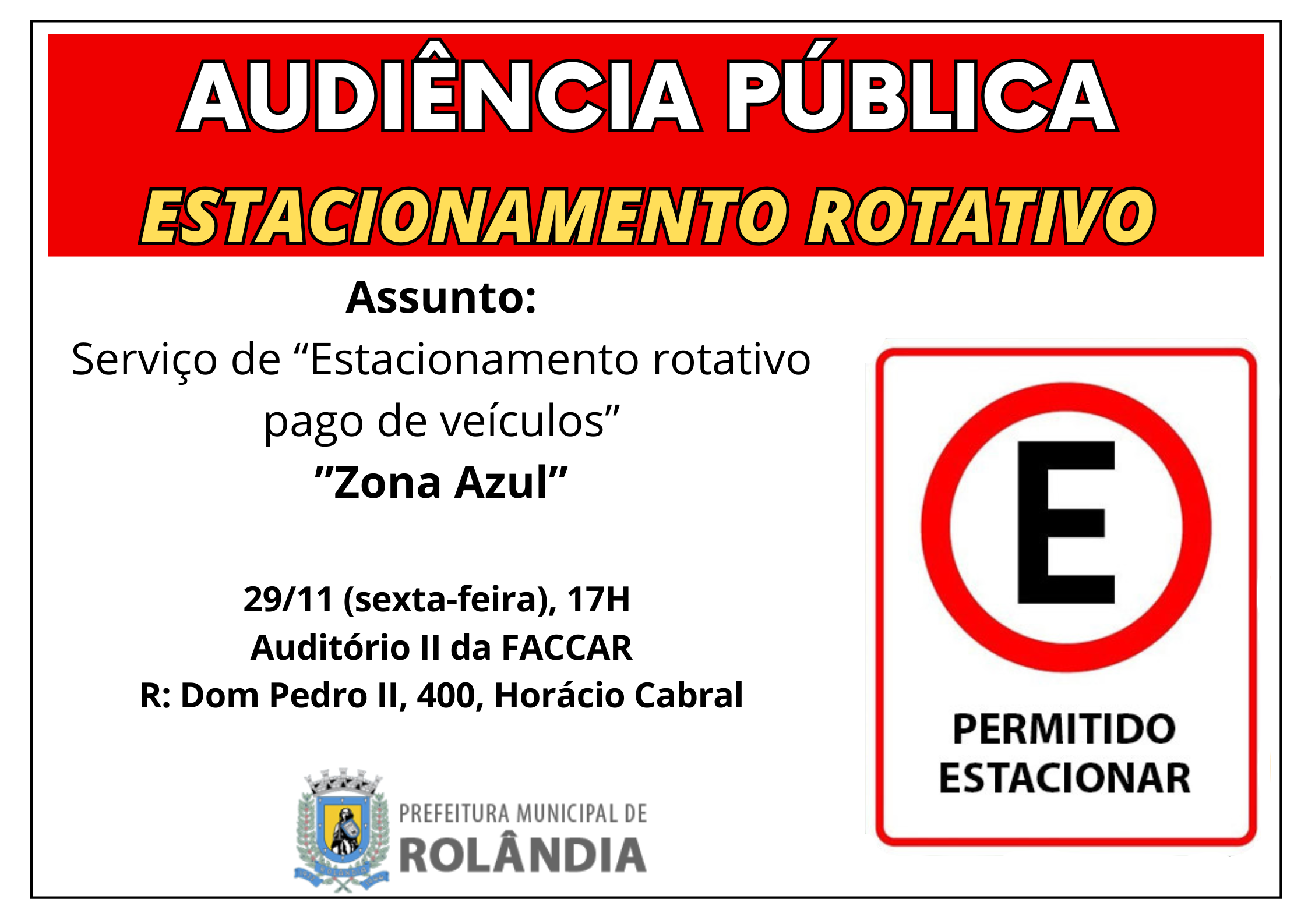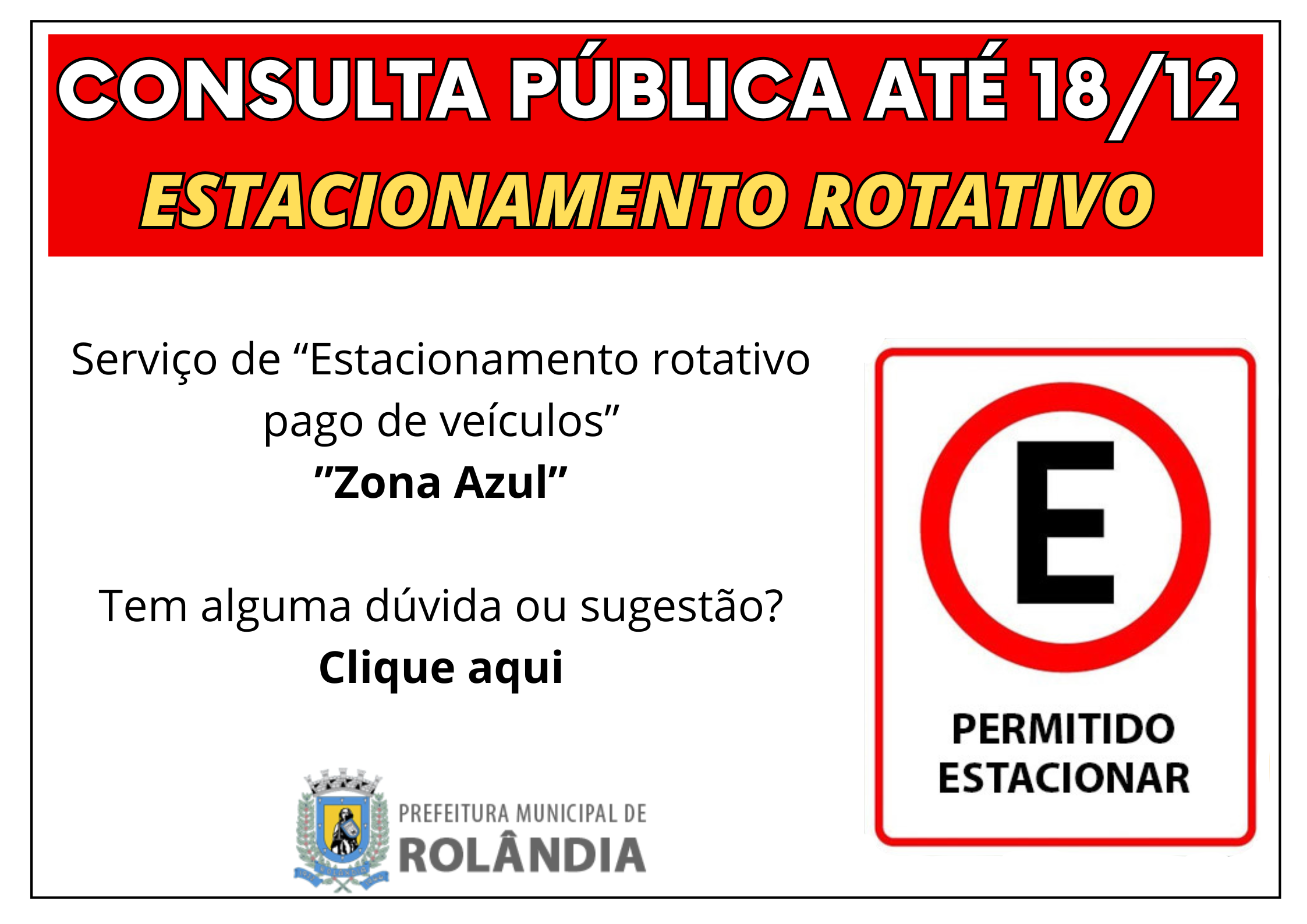 População tem até 18/12 para opinar e sugerir sobre o projeto do estacionamento rotativo. Participe!   Na sexta-feira, dia 29 de novembro, a Prefeitura de Rolândia, por meio da secretaria de Desenvolvimento Eco...