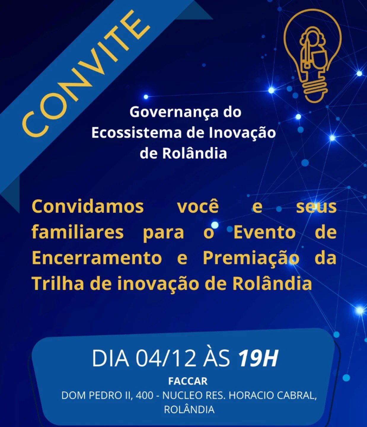 CONVITE ESPECIAL A Governança de Inovação de Rolândia (Inovalândia), a ACIR, o Sebrae e a Prefeitura de Rolândia convidam para o encerramento e a premiação da "Trilha da Inovação"....