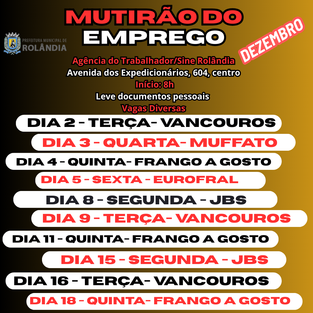 Prefeitura de Rolândia - SINE Vagas de Emprego do dia 09/12/2025 1. Agente de inspeção qualidade/SIF/JBS/SEARA 2. Ajudante de cozinha/JBS/SEARA 3. Ajudante de eletricista 4. Auxiliar de agricultura/Exclusiva PCD/Tem...