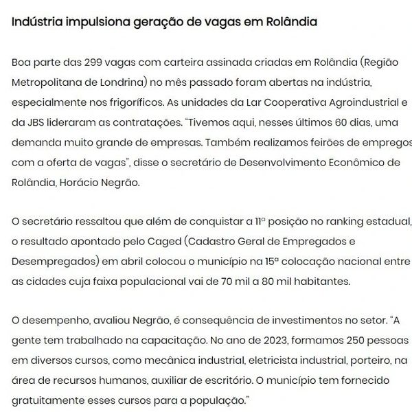 Saiu na Folha de Londrina: Rolândia é destaque na geração de empregos e indus...