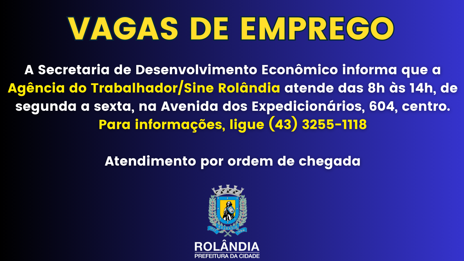 VAGAS DE EMPREGOS A Secretaria de Desenvolvimento Econômico informa que a Agência do Trabalhador/Sine Rolândia atende das 8h às 14h, de segunda a sexta, na Avenida dos Expedicionários, 604, centro. Para informa...