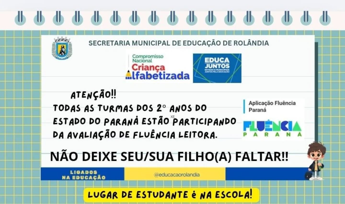 Atenção, Famílias! Informamos que os alunos do 2º ano, matriculados na rede municipal de ensino, estão participando da AVALIAÇÃO DE FLUÊNCIA LEITORA. Esse período vai de 16 a 27/03. ...