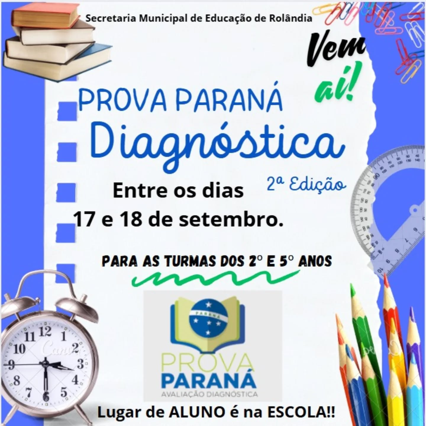 A 2° Edição da Prova Paraná Diagnóstica está chegando!   Nos dias 17 e 18 de setembro os alunos dos 2° e 5° anos, da Rede Municipal de Educação, serão avaliados.  ...