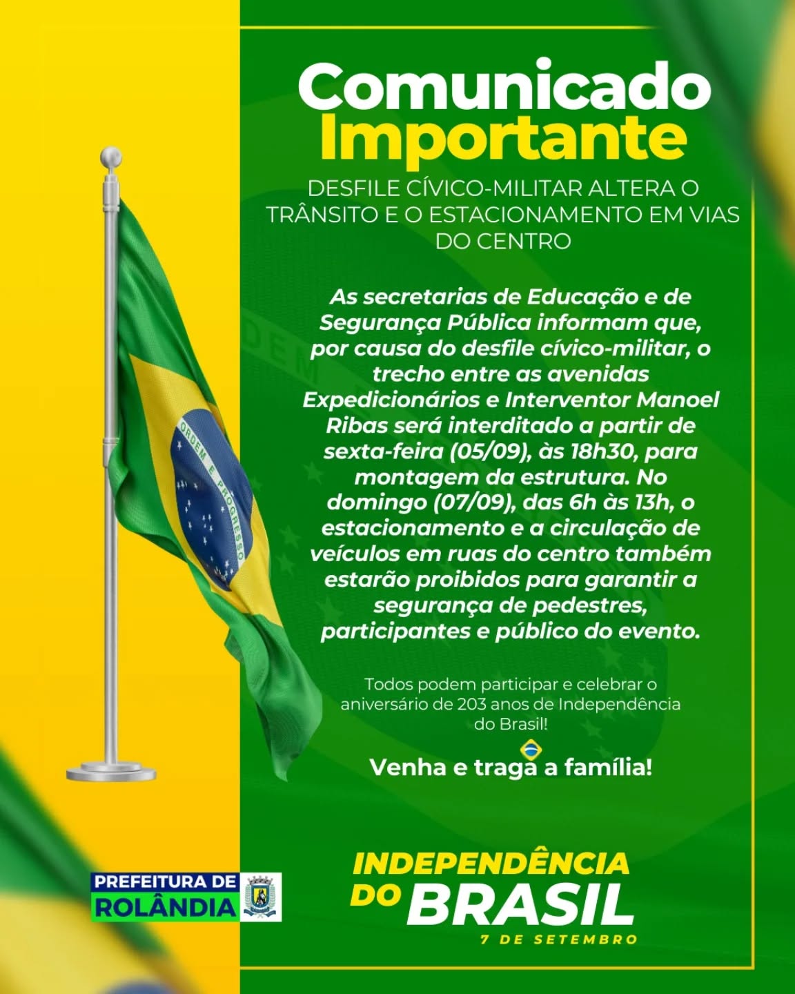 DESFILE CÍVICO-MILITAR ALTERA O TRÂNSITO E O ESTACIONAMENTO EM VIAS DO CENTRO   As secretarias de Educação e de Segurança Pública, Trânsito e Mobilidade Urbana informam que, devido ao desfil...
