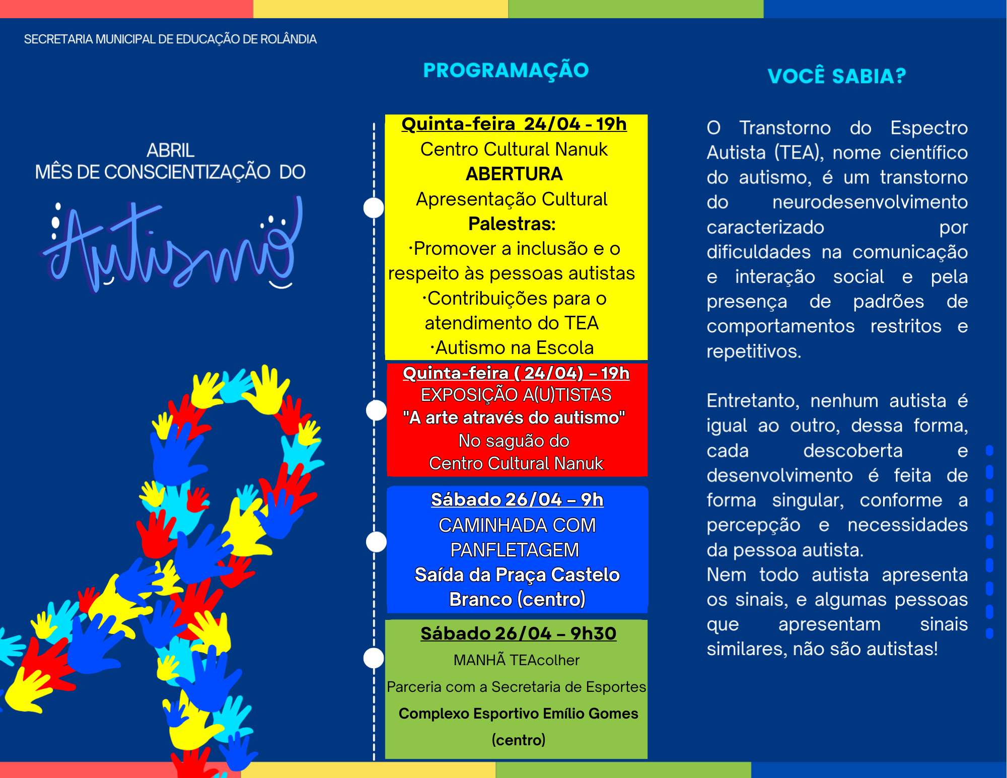 SECRETARIA DE EDUCAÇÃO CONVIDA PARA ATIVIDADES DE INCLUSÃO E RESPEITO SOBRE O AUTISMO A secretaria de Educação informa que para celebrar o “Dia Mundial da Conscientização do Autismo”, ao...