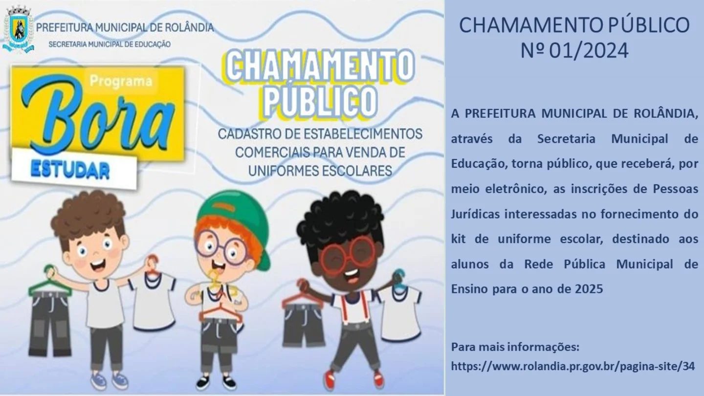 CHAMAMENTO PÚBLICO A secretaria de Educação convida as empresas interessadas em participar do "Bora, estudar!", para o fornecimento de uniformes escolares! Acesse o link e saiba mais detalhes! ...