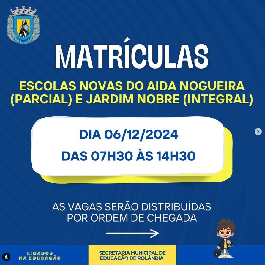 ATENÇÃO: MATRÍCULAS NA ESCOLA DO NOBRE E DO ÁIDA NOGUEIRA A secretaria de Educação informa que para o ano letivo 2025, a rede municipal vai ter duas novas escolas, que serão inauguradas em breve...