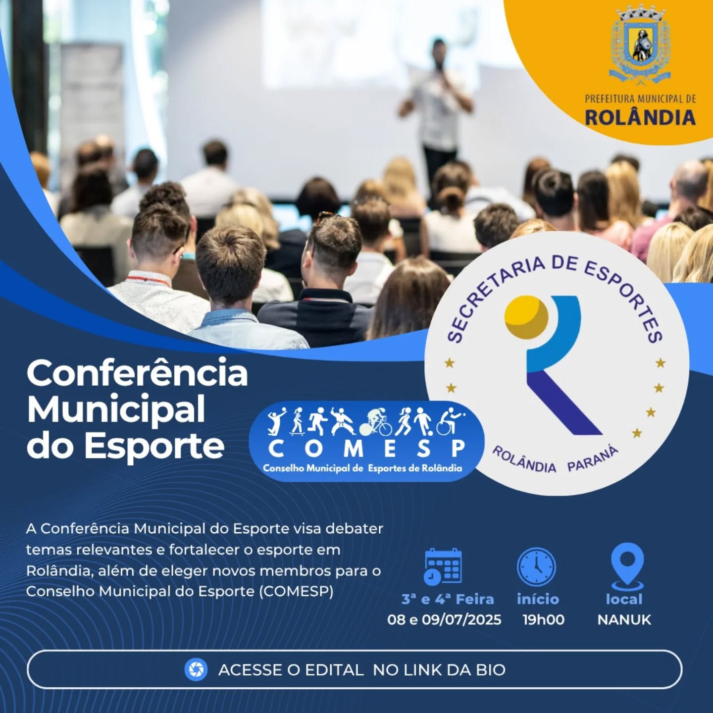 Vamos construir juntos o futuro do esporte em Rolândia!   A Prefeitura Municipal de Rolândia, por meio da Secretaria de Esportes, tem o prazer de convidar você para a Conferência Municipal do Esporte!   ...