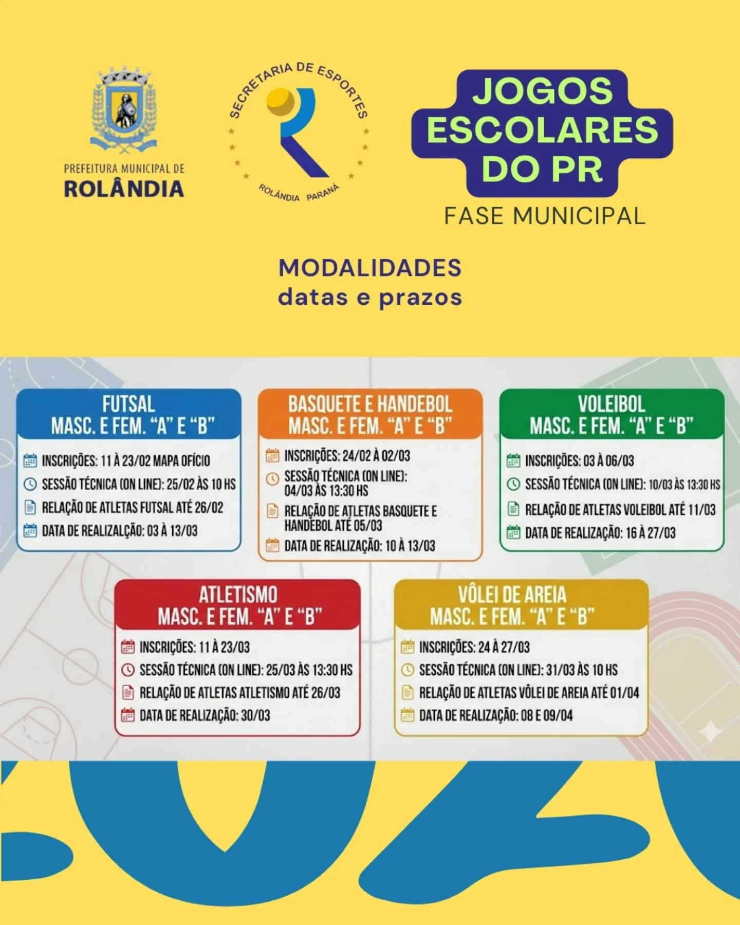 Prepare o coração e o uniforme! A Prefeitura Municipal de Rolândia, por meio da Secretaria de Esportes, apresenta o cronograma oficial dos Jogos Escolares do PR 2026 – Fase Municipal. Confira todos os detalhes para n&...
