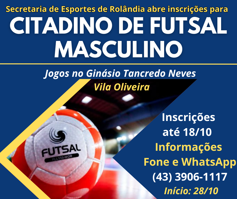 INSCRIÇÕES ABERTAS PARA O CITADINO DE FUTSAL MASCULINO A secretaria de Esportes abriu inscrições para mais um "Citadino de Futsal Masculino". As inscrições podem ser feitas pelo fone e WhatsApp (43) 3906-11...
