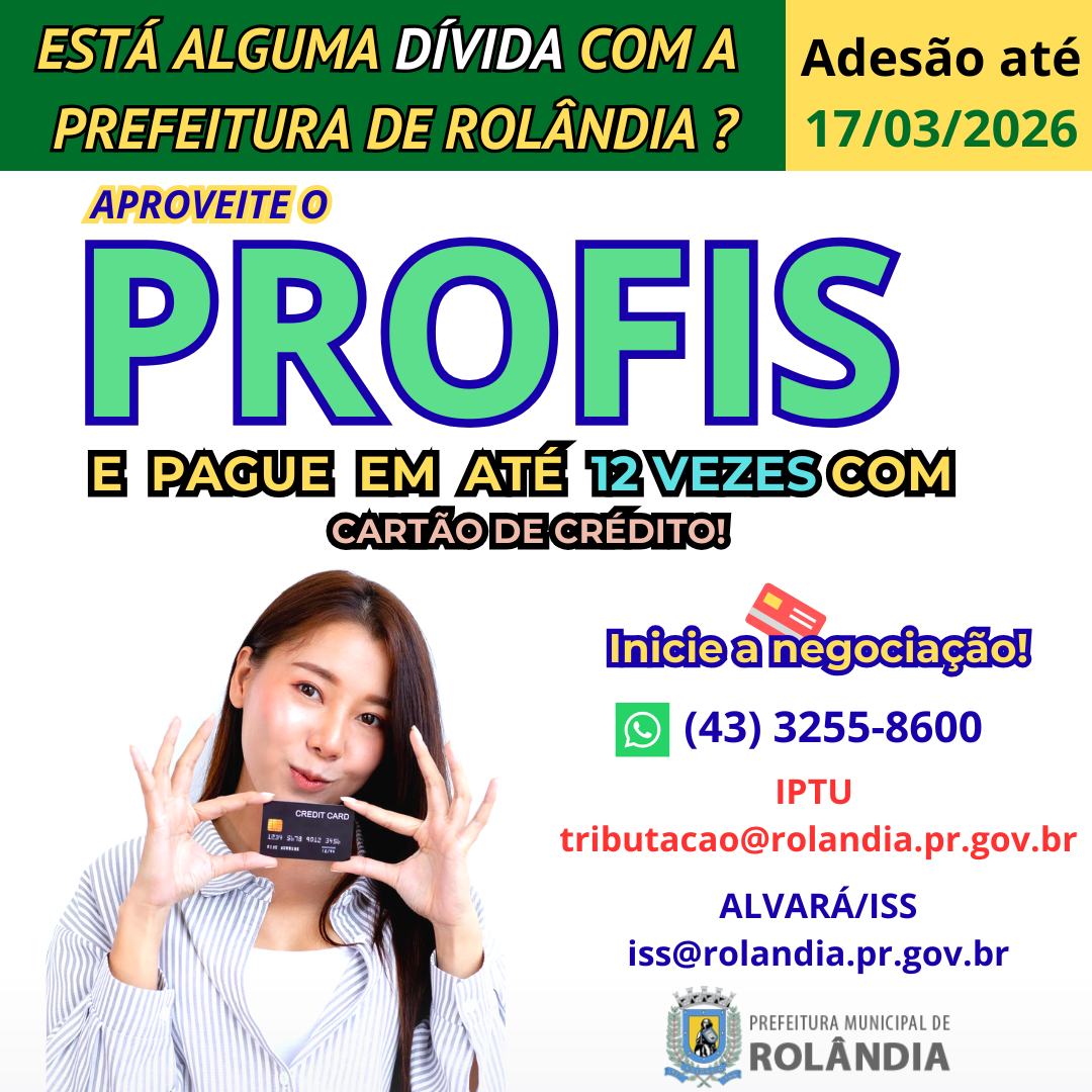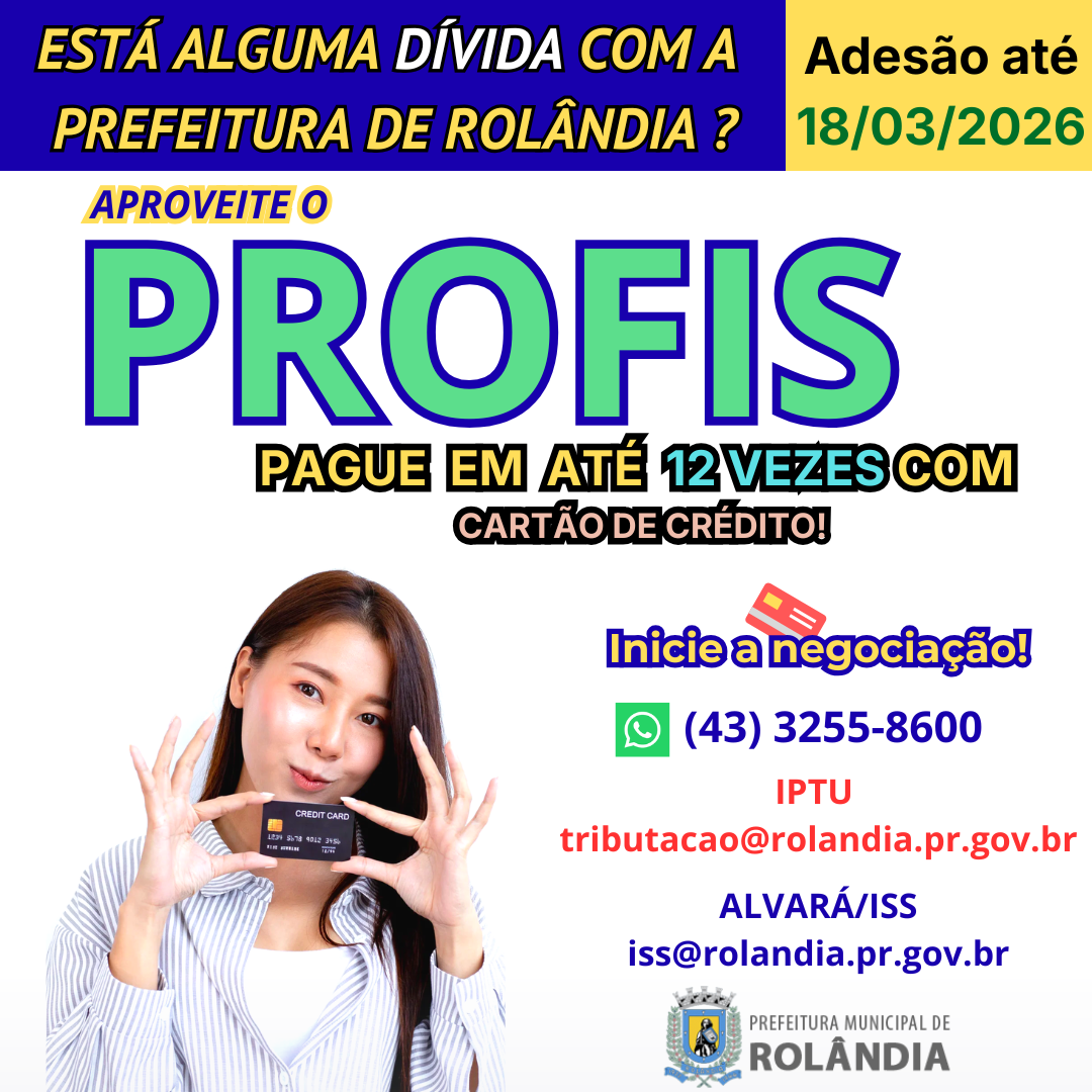 PROFIS ROLÂNDIA EM VIGOR ATÉ 18/03! APROVEITE E PAGUE COM DESCONTO EM JUROS E MULTAS! A secretaria de Finanças informa que está em vigor o Programa de Regularização Fiscal – PROFIS, que oferece des...
