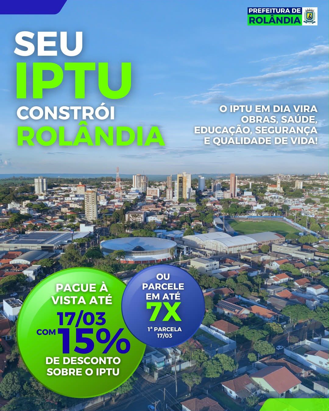 Desconto para pagamento à vista do IPTU chega a 15%; prazo termina em 17/03/2026 A Prefeitura Municipal de Rolândia, por meio da secretaria de Finanças, informa que já foram gerados e lançados os boletos referente...