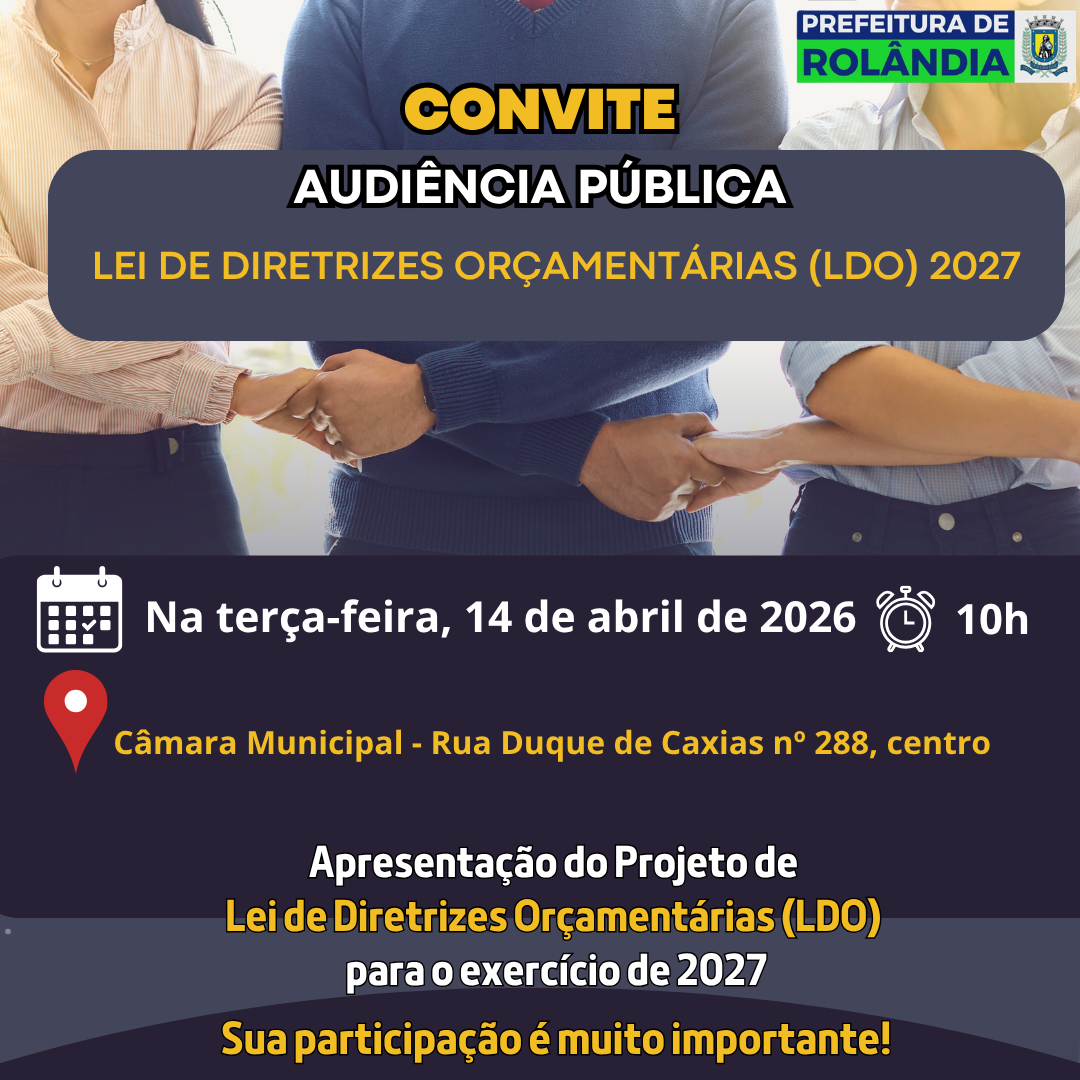 CONVITE AUDIÊNCIA PÚBLICA: LEI DE DIRETRIZES ORÇAMENTÁRIAS 2027 A secretaria de Finanças e a Câmara Municipal de Rolândia, por meio da Comissão de Orçamento, Tributação e Fi...