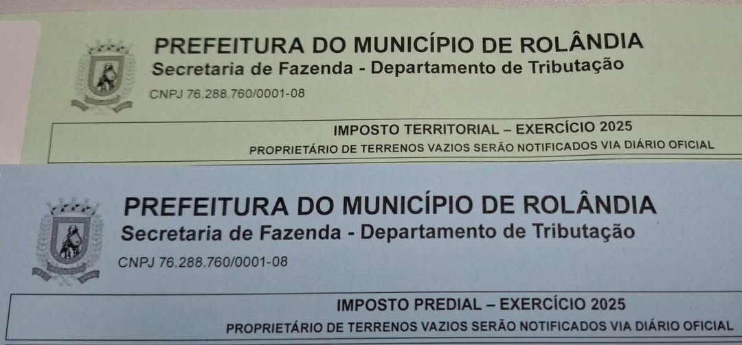 COMUNICADO IMPORTANTE AO CONTRIBUINTE DO MUNICÍPIO DE ROLÂNDIA A Prefeitura Municipal de Rolândia informa que está distribuindo nos endereços o carnê do IPTU 2025. O tributo só pode ser pago a part...