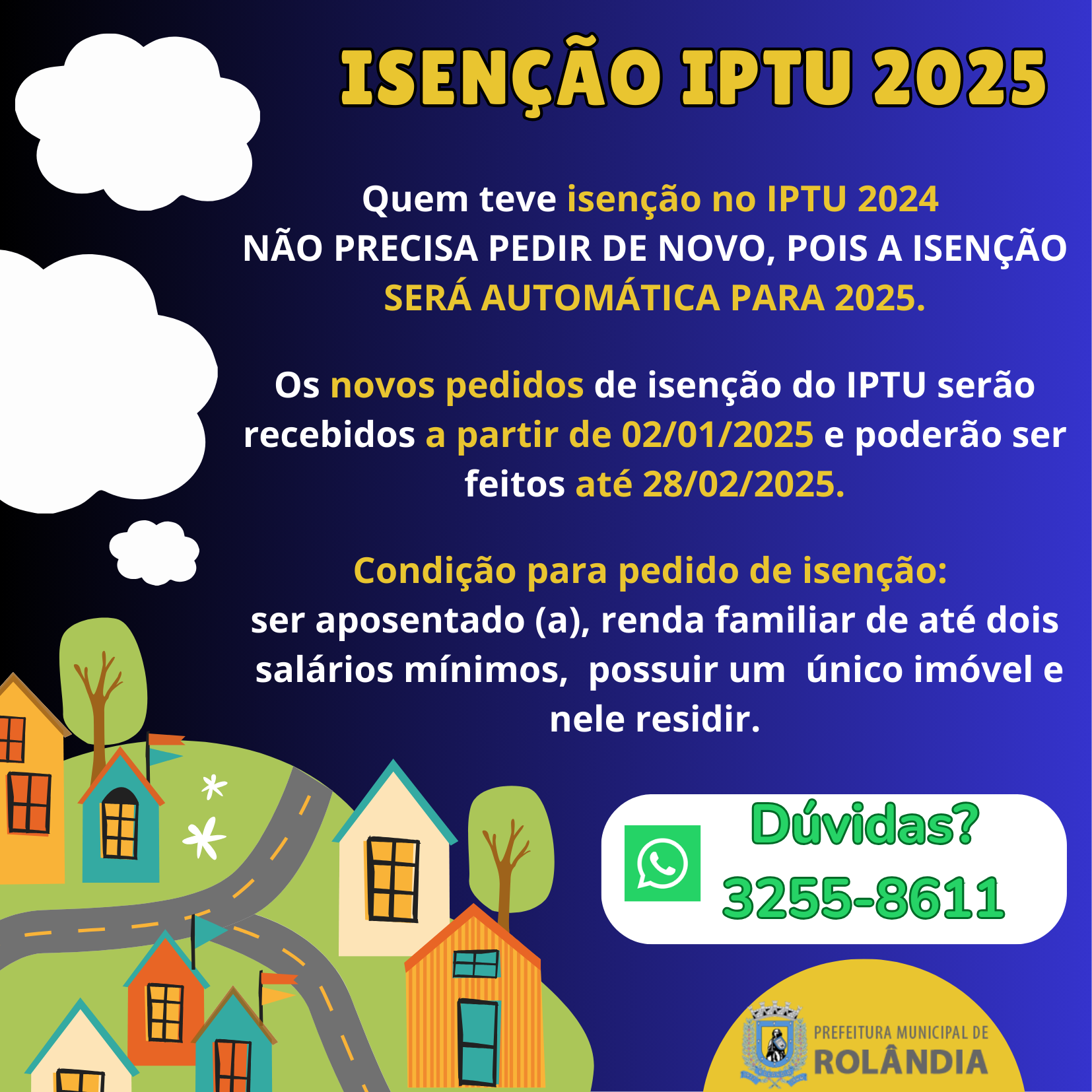 SAIBA SOBRE O PEDIDO DE ISENÇÃO DE IPTU 2025 A secretaria de Finanças informa que o contribuinte que teve isenção no IPTU 2024 NÃO PRECISA PEDIR DE NOVO, POIS A ISENÇÃO SERÁ AUTOM&...