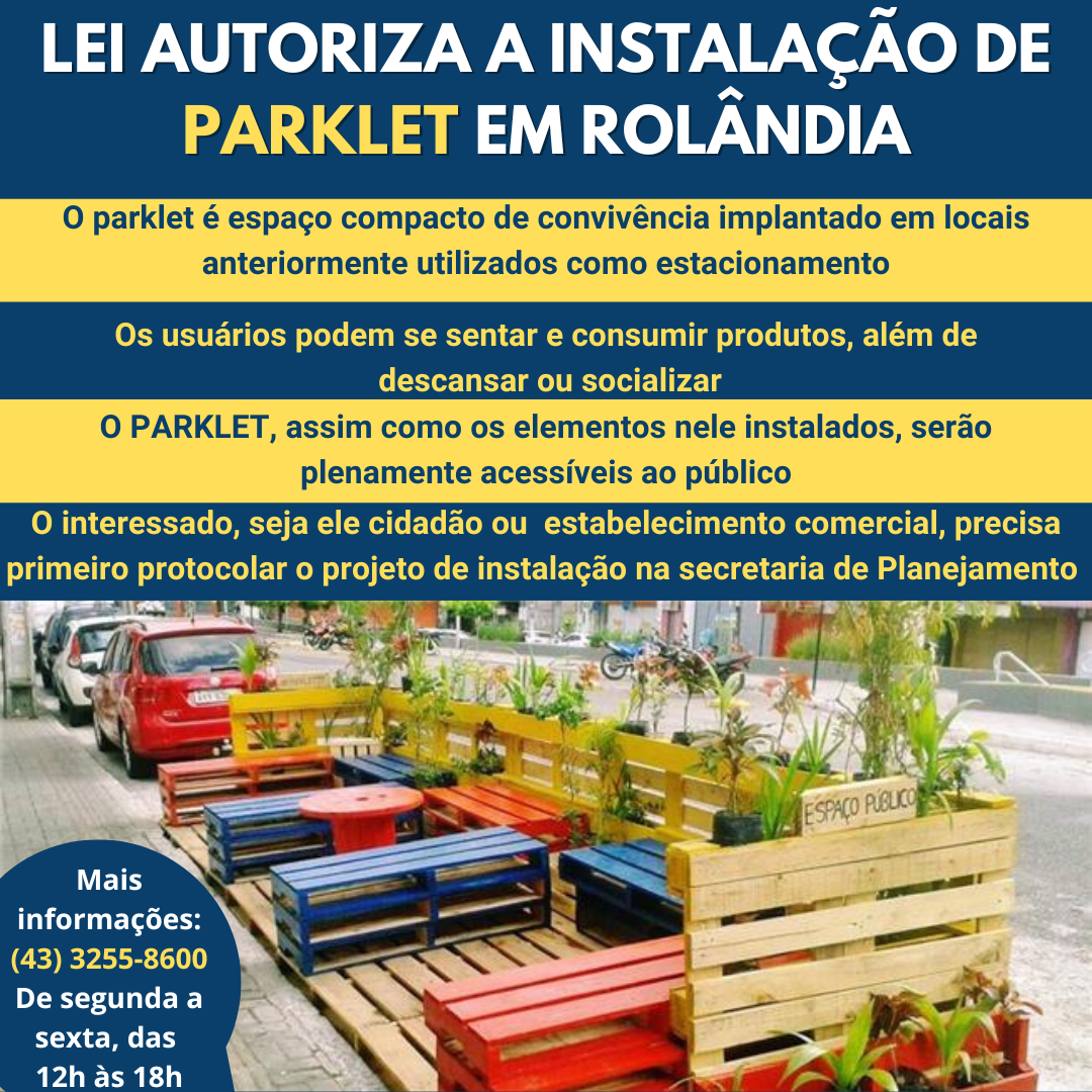 LEI AUTORIZA A IMPLANTAÇÃO DE PARKLET EM ROLÂNDIA Entrou em vigor a lei municipal 4.245/2024, que autoriza a implantação de PARKLET.   Você sabe o que PARKLET? O parklet é um miniparque, i...